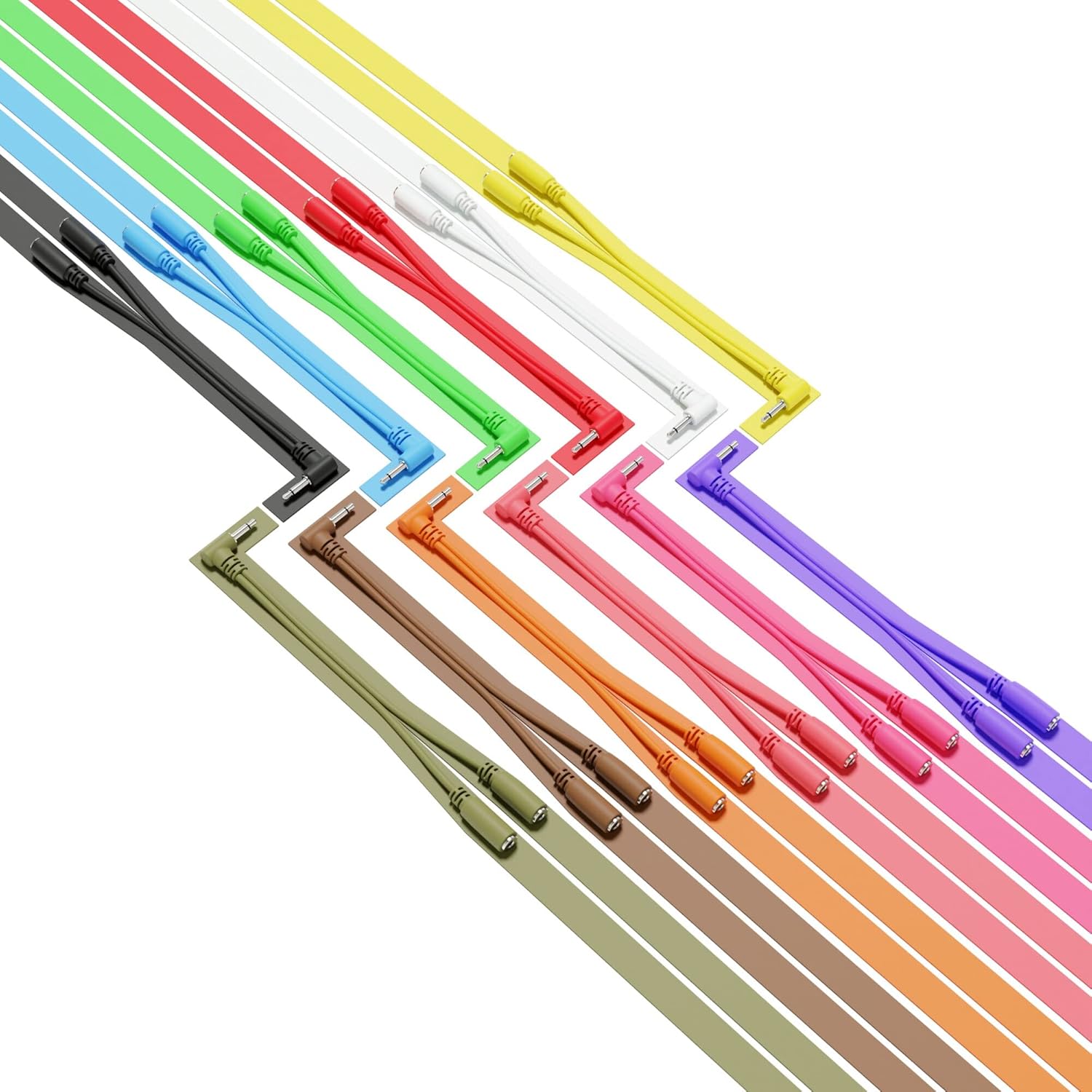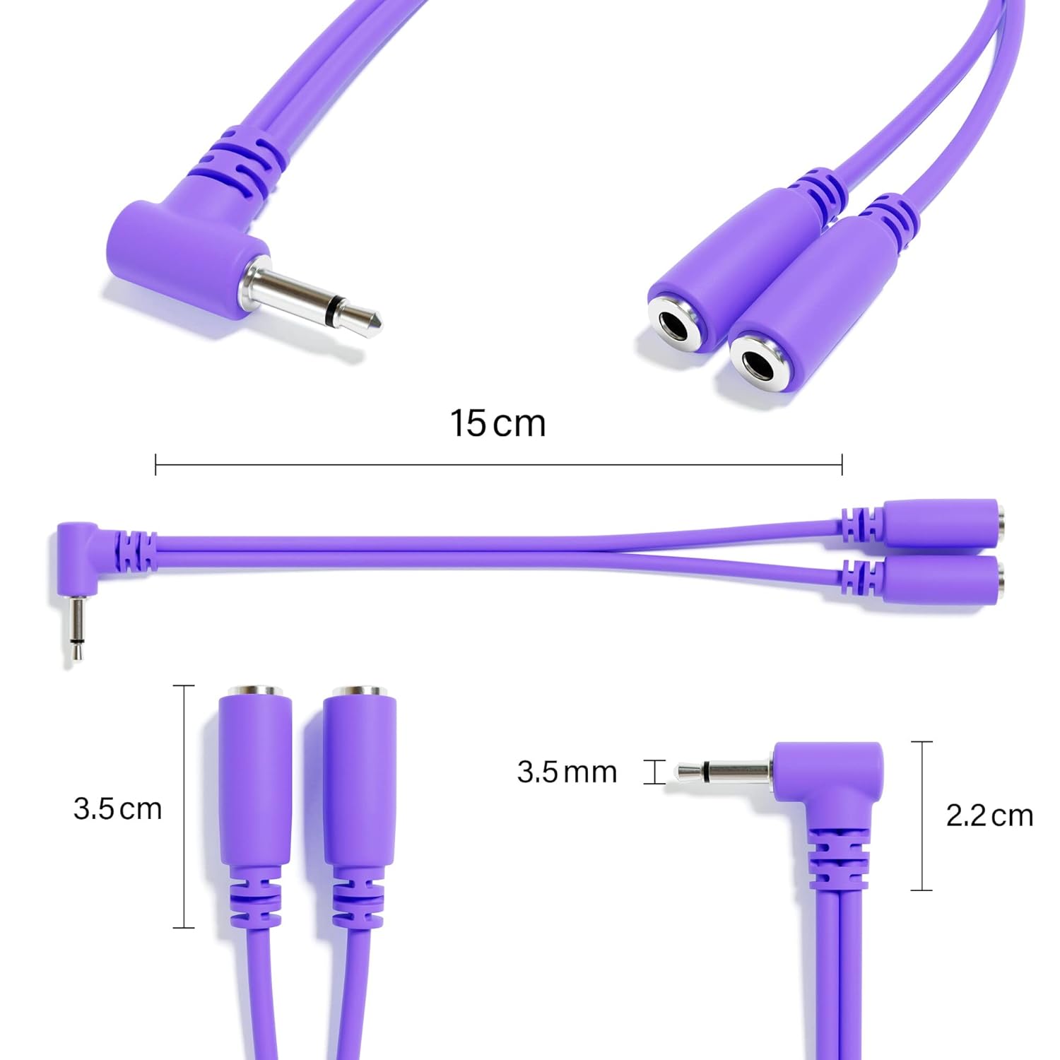 ExcelValley - Right Angle Mono Splitter Y Patch Cables - TS 3.5mm 1/8" Eurorack Synth SynthesizerSuitable for your Eurorack modular synthesizer, or other general patching duties, where a mono splitter cable is needed.Great stackable patch cable alternative. Split audio and CV signals to get more out of your eurorack system. This splitter cable does not take up precious rack space and the slim male plug does not block adjacent sockets.The patch cables you use with your Eurorack modular synthesizer may very well take more abuse than any other cables in your studio or stage rig.FeaturesSet of multiple pieces, different colors & 1 lengthOnly 13mm high when patchedFully molded patch cables constructed of 26AWG stranded copper wire99.99% pure and oxygen free copperNickel plated connectors provide high corrosion protectionFlexible strain reliefCompatible with: Roland, Moog, Doepfer, Arturia, KorgSpecificationsConnectors:1 x Male - TS 3.5 mm (1/8" - 1/8 inch) - Analog Mono Jack - Angled2 x Female - TS 3.5 mm (1/8" - 1/8 inch) - Analog Mono SocketType: Mono Splitter Patch CablesWire size: 26 AWG - American Wire GaugeConnection split: 1:2Cable length: 15 cm - 5.91 inch - 0.49 feetPackage (Options):6A-Pack - 6 pieces: Black, Blue, Green, Red, White, Yellow6B-Pack - 6 pieces: Army Green, Brown, Orange, Peach, Pink, Purple10-Pack - 10 pieces: Black, Blue, Green, Orange, Peach, Pink, Purple, Red, White, Yellow12-Pack - 12 pieces: Army Green, Black, Blue, Brown, Green, Orange, Peach, Pink, Purple, Red, White, Yellow13-Pack - 13 pieces: Army Green, Black, Blue, Brown, Green, Grey, Orange, Peach, Pink, Purple, Red, White, Yellow