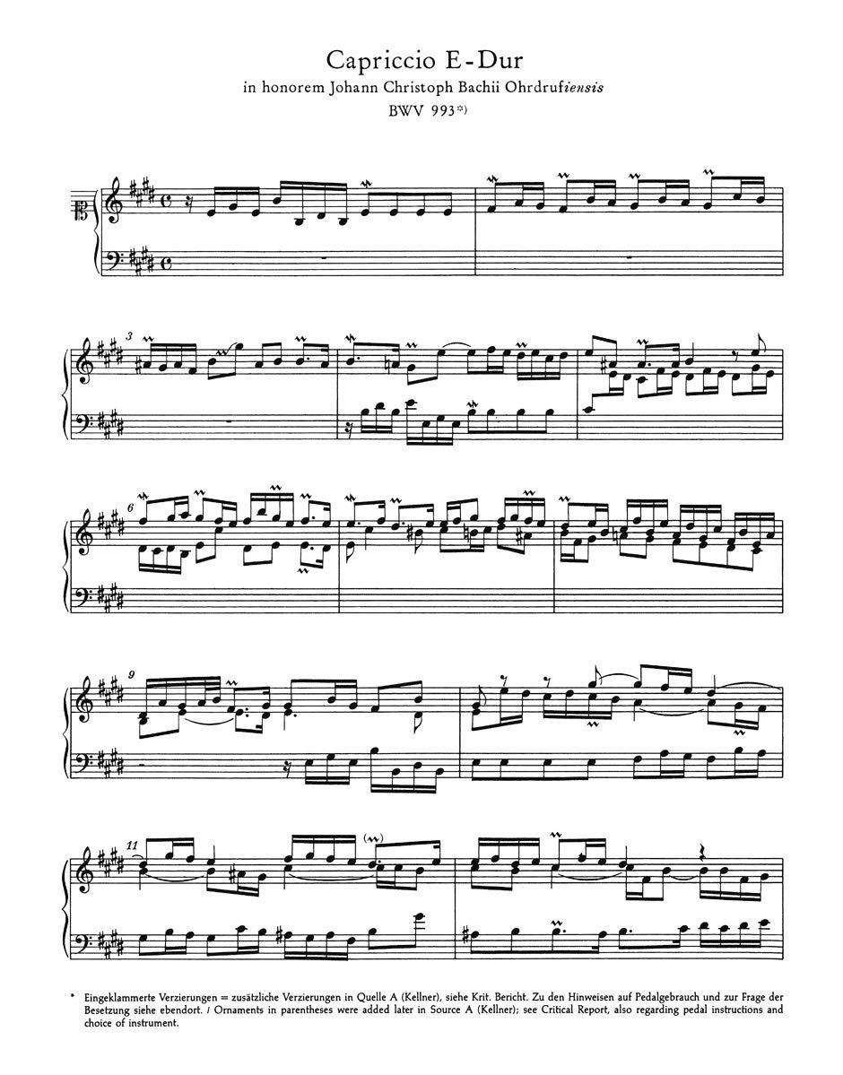 Although Johann Sebastian Bachs vocal music fell largely into oblivion after his death, his keyboard music continued to be played. In addition to his large-scale collections, a number of works that survived in isolation were already highly popular during the eighteenth century. Foremost among these was the Chromatic Fantasy and Fugue, BWV 903, followed by the C-minor Fantasy, BWV 906 (see volume 2, BA 5233). With some justification, the clavier pieces in this volume may be viewed as peripheral to Johann Sebastian Bachs uvre as compared, say, to the Partitas or the French and English Suites. But they are peripheral in another sense as well: all of them evidently originated early in his career prior to the English Suites, which are known to date from his Weimar years. Both their style and their manuscript traditions place them in Bachs youthful period sometime between 1700 and 1710. In the course of preparing this edition a number of works attributed to Bach were shown to be spurious. As a result, those pieces that remain sharpen our awareness of the stylistic characteristics of his early music and deepen our understanding of his musical origins. It is perhaps here and in their youthful vigor and charm - that their principal value lies for us today. - Urtext of the New Bach Edition - Contents: Capriccio B-flat major, BWV 992 [Bach, Johann Sebastian]; Capriccio E major, BWV 993 [Bach, Johann Sebastian]; Aria variata A minor, BWV 989 [Bach, Johann Sebastian]; Sonata D major, BWV 963 [Bach, Johann Sebastian]; Overture F major, BWV 820 [Bach, Johann Sebastian]; Suite F minor, BWV 823 [Bach, Johann Sebastian]; Suite A major, BWV 832 [Bach, Johann Sebastian]; Praeludium et Partita del tuono terzo (F major), BWV 833 [Bach, Johann Sebastian]; Overture G minor, BWV 822, Praeludium, Fugue and Allegro E-flat major for Lute or Cembalo, BWV 998 [Bach, Johann Sebastian]; Read more