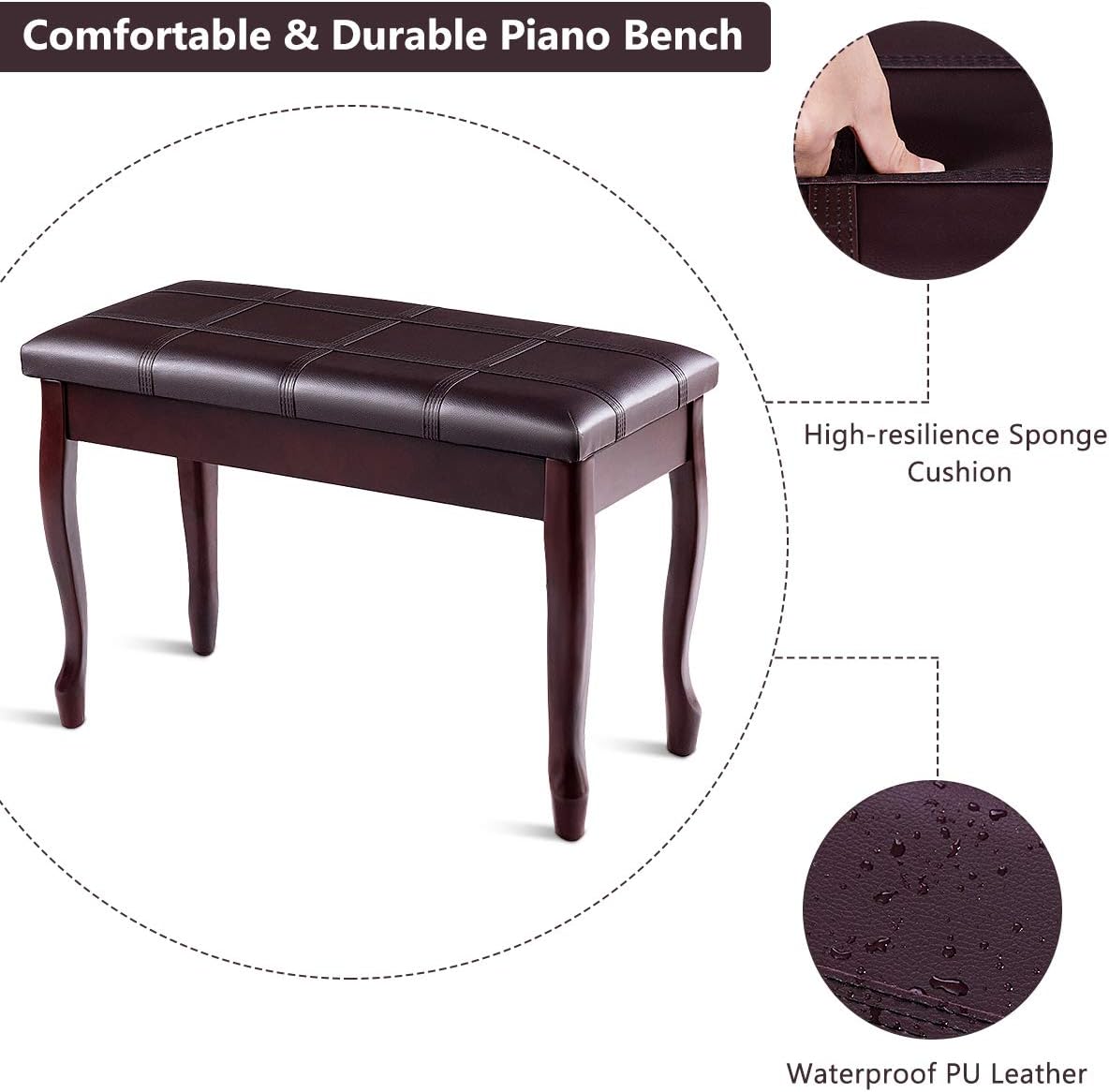 Description:This is our high quality and stylish piano bench which offers a comfortable place for you to practice the piano. Constructed with sturdy solid wood, the piano bench can support two persons safely. Covered with PU leather and padded withhigh-resilience sponge, you will feel more enjoyable and relaxed. Equipped with a large storage compartment under the seat that provides specious space for holding sheet music and books. What's more, it has anti-slip feet pads under wooden legs, protecting your floor from being scratched. Don't hesitate to buyone!Features:Solid wood construction for years of useCovered with PU leather and padded with high-resilience sponge, comfortable seatWith a storage compartment to store books, sheet music,etcFoot pad under each leg to protect floor from scratchElegant appearance make it available in different finishes to blend in with any decorLight weight and easy to moveSuitable for orchestras, recording studio, musicbands, concerts, etcEasy to assemble and easy to cleanSpecifications:Color: BrownMaterial: PU leather and solid woodOverall size: 29.5''x14''x19.5'' (LxWxH)Weight capacity: about 360 lbsNet weight: about 14 lbsPackage includes:1 x Piano Bench