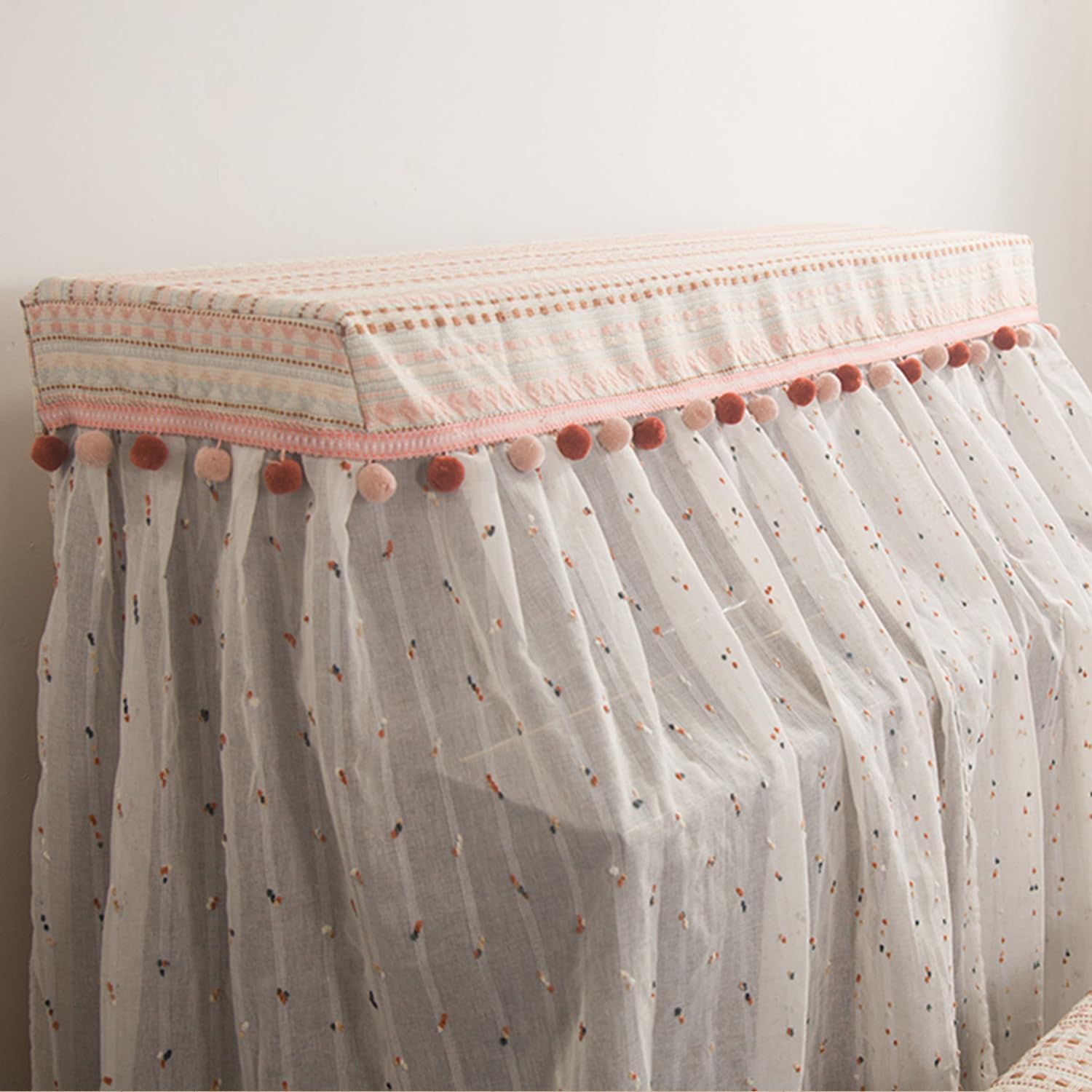 Transform your upright piano into an enchanting focal point with this MyBolin bohemian lace piano cover. The elegant design features a white lace base adorned with delicate floral patterns and charming pink pom-pom trim that adds whimsical texture. The top section showcases a beautiful bohemian-inspired fabric with geometric patterns in soft pink tones, creating a perfect balance between classic and contemporary style. The breathable fabric drapes gracefully from top to bottom, providing comprehensive coverage while maintaining a sophisticated appearance. The thoughtfully designed cover includes a decorative horizontal pom-pom trim that creates a stunning visual transition between the patterned top and flowing lace skirt. Perfect for protecting your cherished instrument from dust and daily wear while adding a touch of romantic charm to your space. This full-coverage piano cover combines practical protection with artistic flair, making it an ideal choice for both home musicians and interior design enthusiasts who appreciate the fusion of functionality and style.
