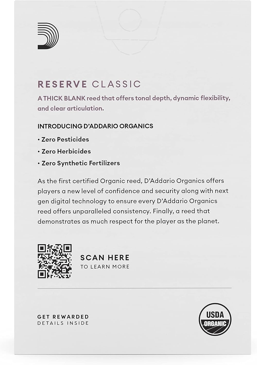 As the first certified Organic reed, D’Addario Organics offer players a new level of confidence and security along with next gen digital technology to ensure every reed offers unparalleled consistency. Crafted with a longer vamp for flexibility of color and volume, these Classic Bb Clarinet reeds contain squared tip corners for ease of response, plus a thicker tip for added support. Each reed in the pack comes individually-sealed in a recyclable paper reed holder and flow wrap.