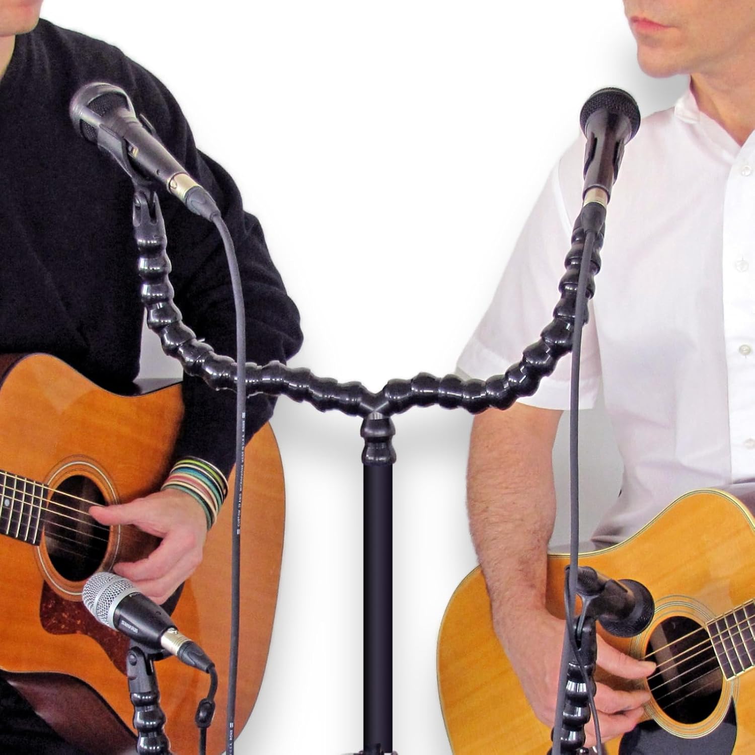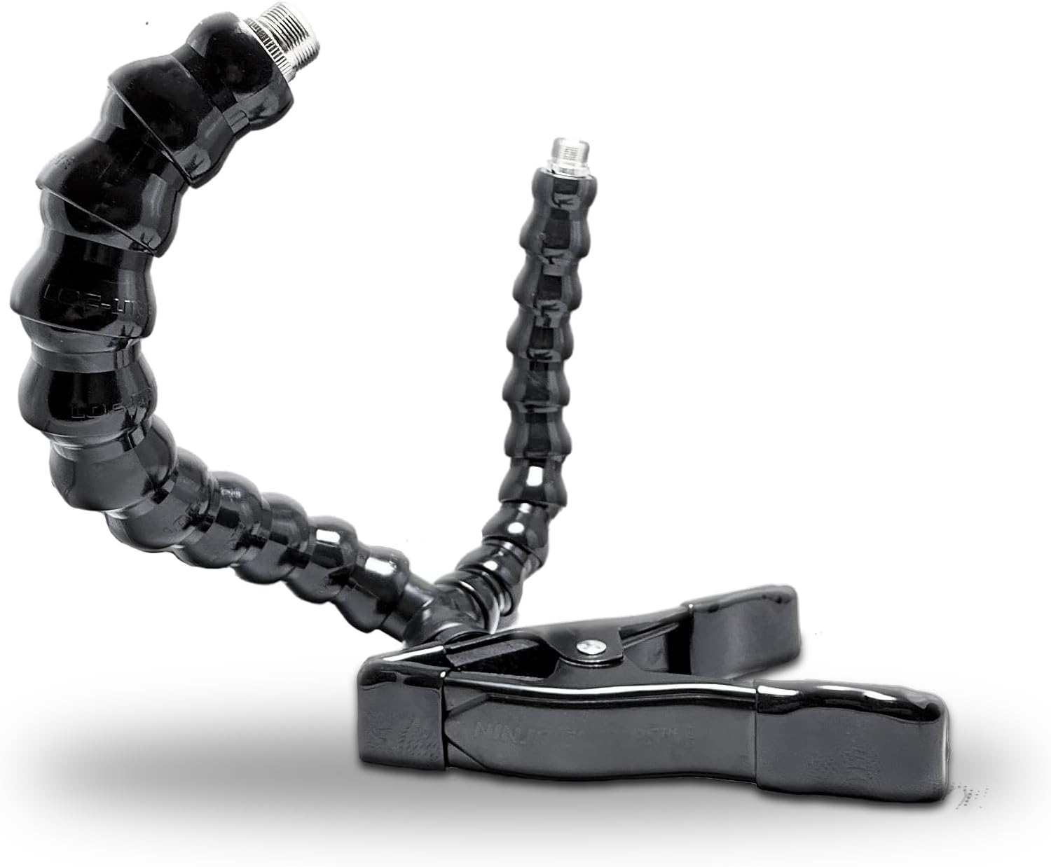 Transform your audio setup with the Stage Ninja 2MIC-12-CB dual gooseneck mic clamp. This professional-grade mounting solution features two independent 12-inch scorpion-style arms that provide precise positioning for microphones and accessories. Each gooseneck offers adjustable tension for perfect balance, supporting gear up to 2.4 pounds without sagging. The industrial-strength steel clamp base securely grips surfaces up to 2 inches thick, while rubber-lined jaws ensure surface protection. With standard 5/8"-27 threads compatible with most mic clips and shock mounts, this versatile tool excels in live sound, studio recording, and broadcast applications. Perfect for dual snare setups, drum overheads, audience mics, or creative mounting of lights and cameras. Built in the USA with all-metal construction - including steel clamp base, flexible steel goosenecks, and aluminum fittings - this 13-inch tall mount delivers exceptional durability and reliability for demanding professional environments. The black glossy finish adds a sleek touch to this robust piece of gear.