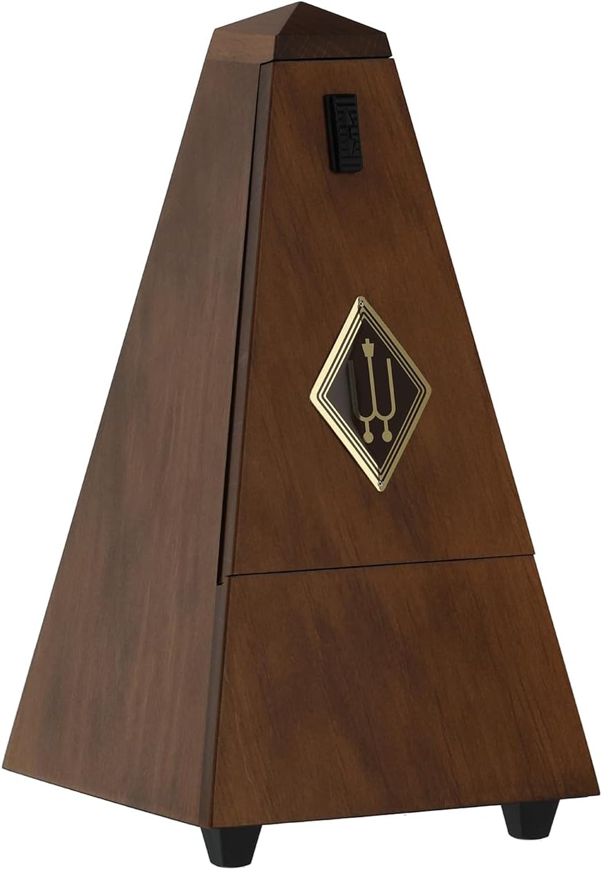 Wood casing - walnut Colored; high quality German craftsmanship from one of the most respected names in Metronomes. Polished wooden case. Traditional windup power supply with visual pendulum movement and audible ticking sound. Adjustable from 40 - 208 beats per minute.