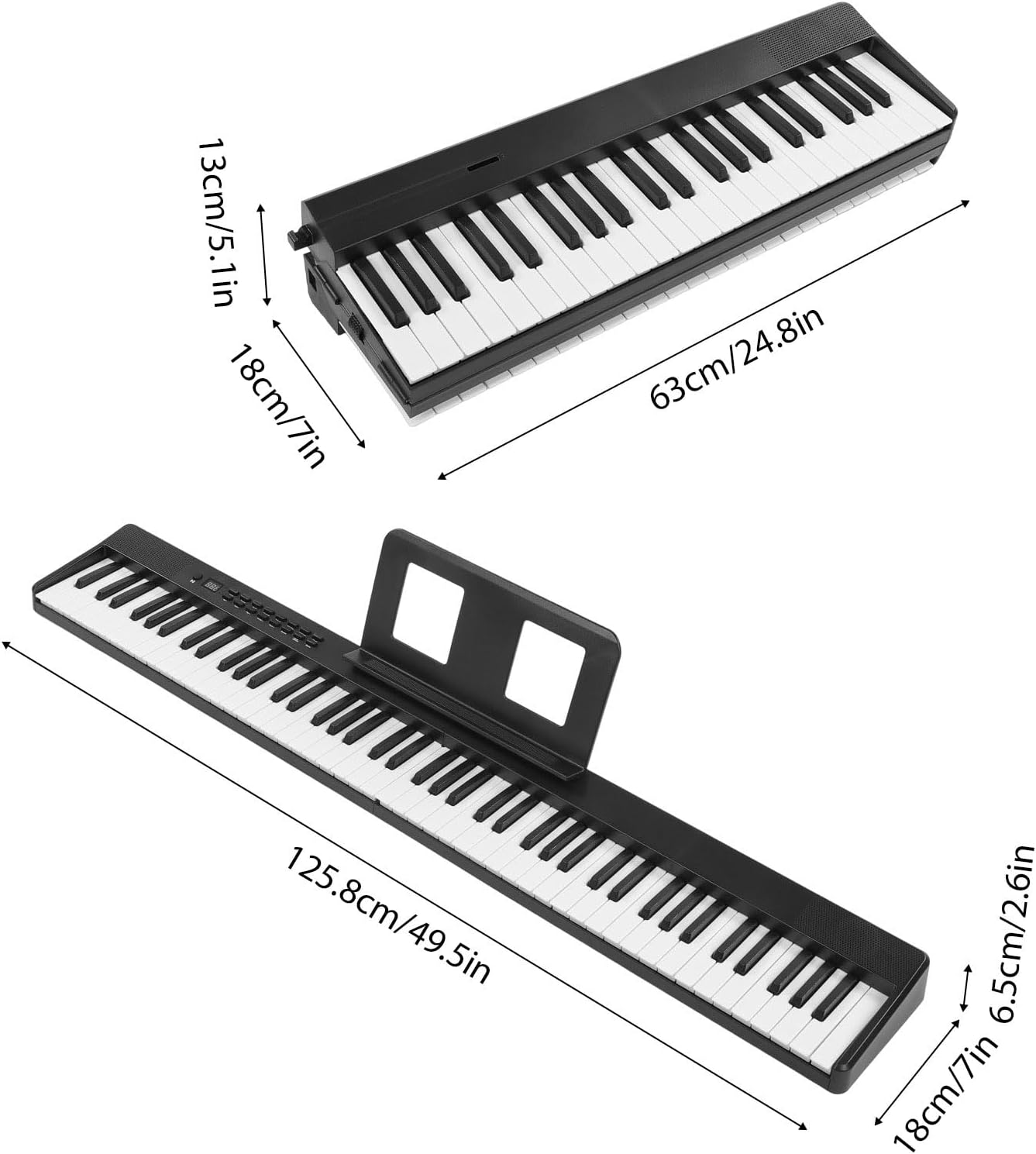 1. [ULTRA-PORTABLE DESIGN] Take your music anywhere with a compact and foldable 88-key keyboard piano 2. [FULL-SIZED RESPONSIVE KEYS] Experience dynamic performances with touch-sensitive standard keys 3. [MULTI-FUNCTIONAL PRACTICE CENTER] Unlock creativity with 128 tones, rhythms, and BT connectivity 4. [SEAMLESS DIGITAL INTEGRATION] Easily connect to computer software via MIDI/USB for music production 5. [STABLE PERFORMANCE & LONG BATTERY LIFE] Enjoy reliable playtime with central locking structure and integrated rechargeable battery Specification: Material: ABS Battery Type: Rechargeable Battery (Built-in) Battery Capacity: Approx. 1000mAh Folding Size: Approx. 63 * 8 * 13 cm / 24.8 * 3.1 * 5.1 inch Unfolding Size : Approx. 125.8 * 18 * 6.5 cm / 49.5 * 7.0 * 2.6 inch Package List: 1 * Piano 1 * Music Stand 1 * Charging Cable 1 * Sustain Pedal 1 * Storage Bag 1 * User Manual
