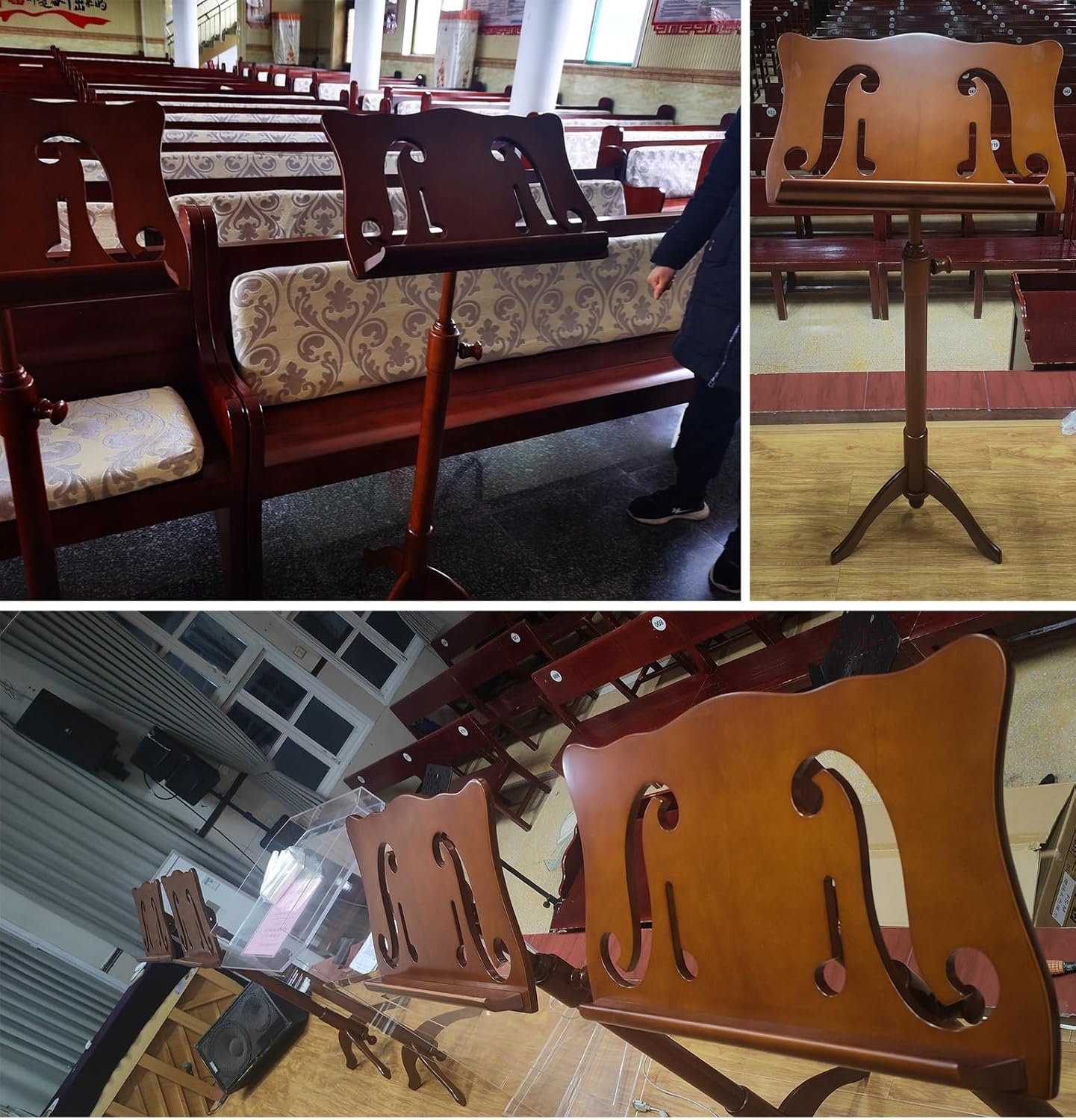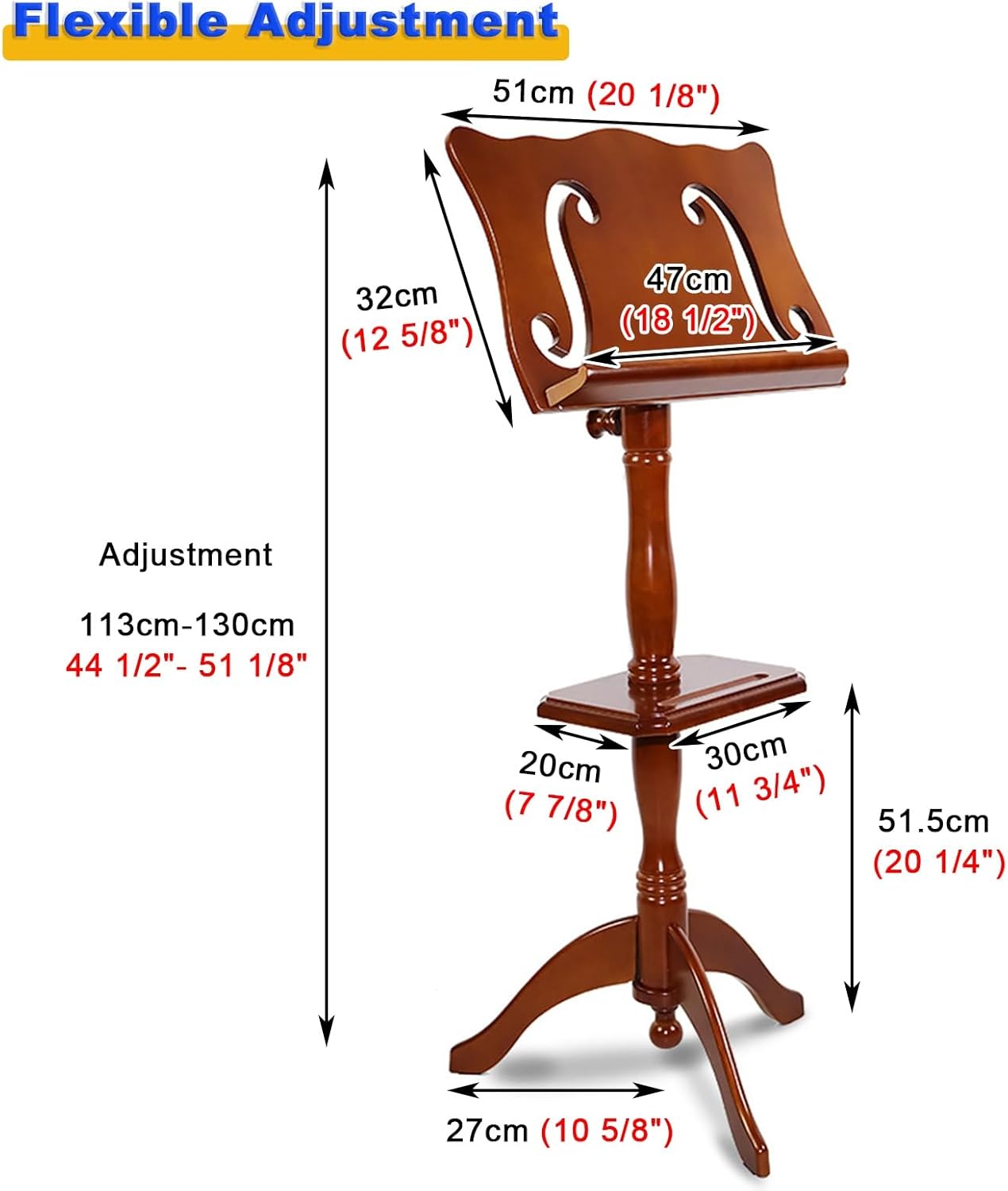 Reading sheet music has never been easier.Package Contents:1 × Music StandSpecification:- Material: Solid Wood - Adjustment Height: 113cm - 130cm(44 1/2" - 51 1/8" )Feature:- Stability with a tripod base.- Can prevent neck damage.- It is appropriate for all ages.- Adaptable to different heights.- Provide stability and portability.- Durable professional music stand.- Suitable for use in all types of environments.- Suitable for instrumental performance bookshelves.(Such as: guitar, violin, drums, saxophone)Kind Reminder:- Minor errors can occur due to different batches and manual measurements. Thank you for your understanding.- There may be some differences between the image and the product due to display and lighting reasons, please refer to the actual product.Satisfactory Service:-We provide you with the most trusted service. If you have any questions, please contact us in time to serve you.