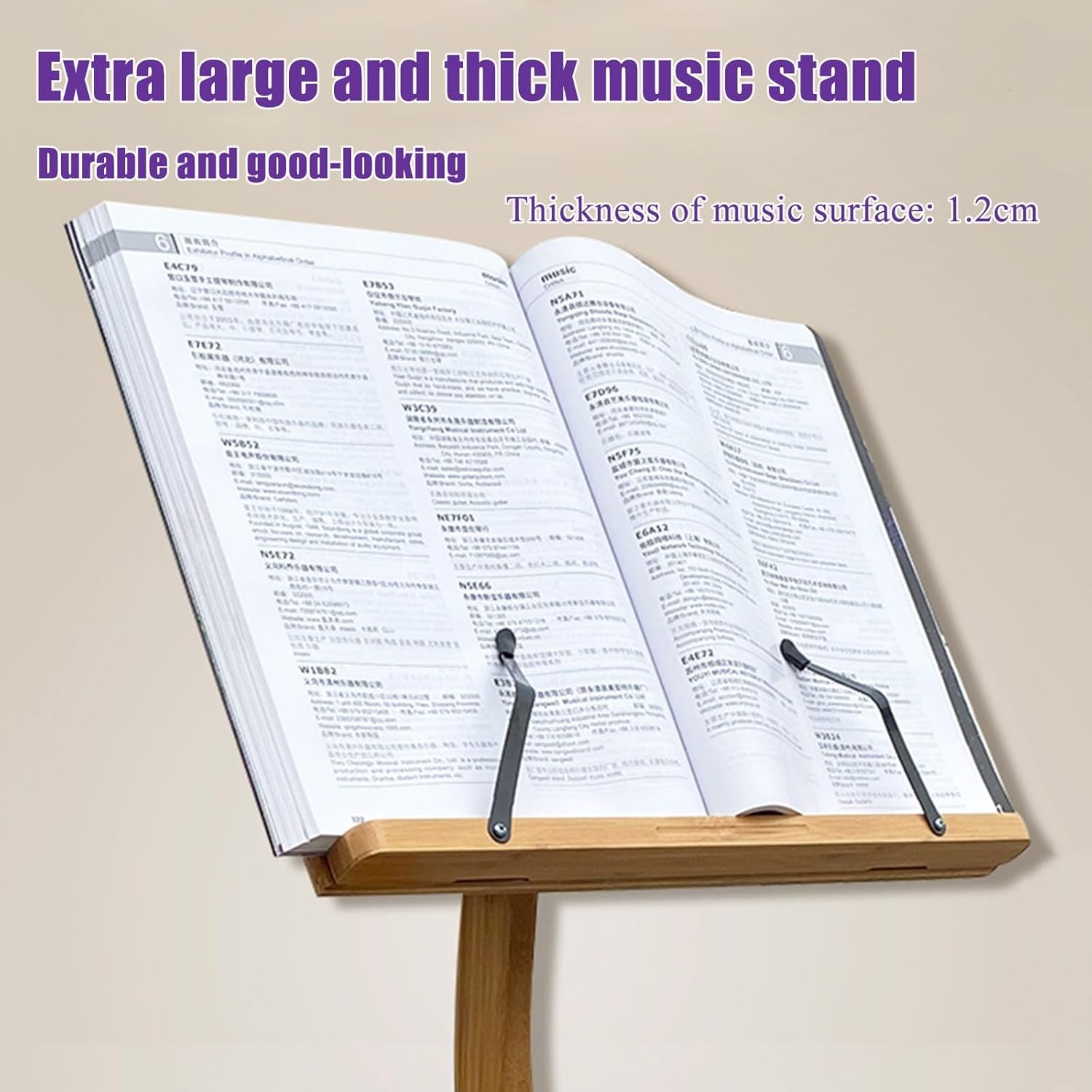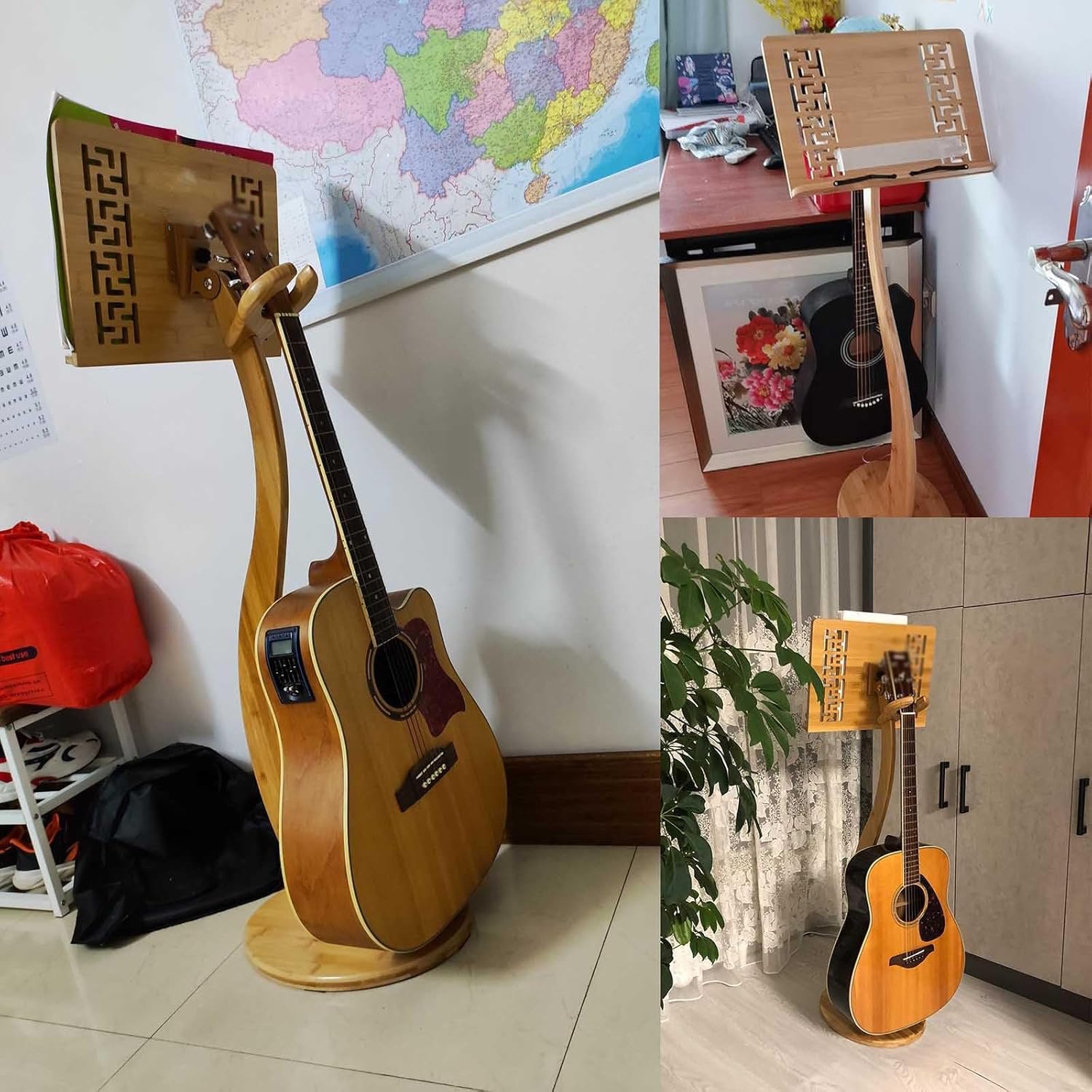 Name: Sheet Music Stand Material: bamboo wood Colour:Original wood Sheet music board size: 40×29cm (16×11.5 inches) Height: 115cm (45 inches) Features: sheet music stand and guitar stand 2 in 1 Package Includes 1*Guitar sheet music stand Attention: 1.The package includes only the sheet music stand, the instrument shown in the picture is not included 2.Due to different shooting tools, there may be a certain colour difference, it is not a quality problem, please prevail in kind! 3.Manual measurement, the size may have a slight deviation