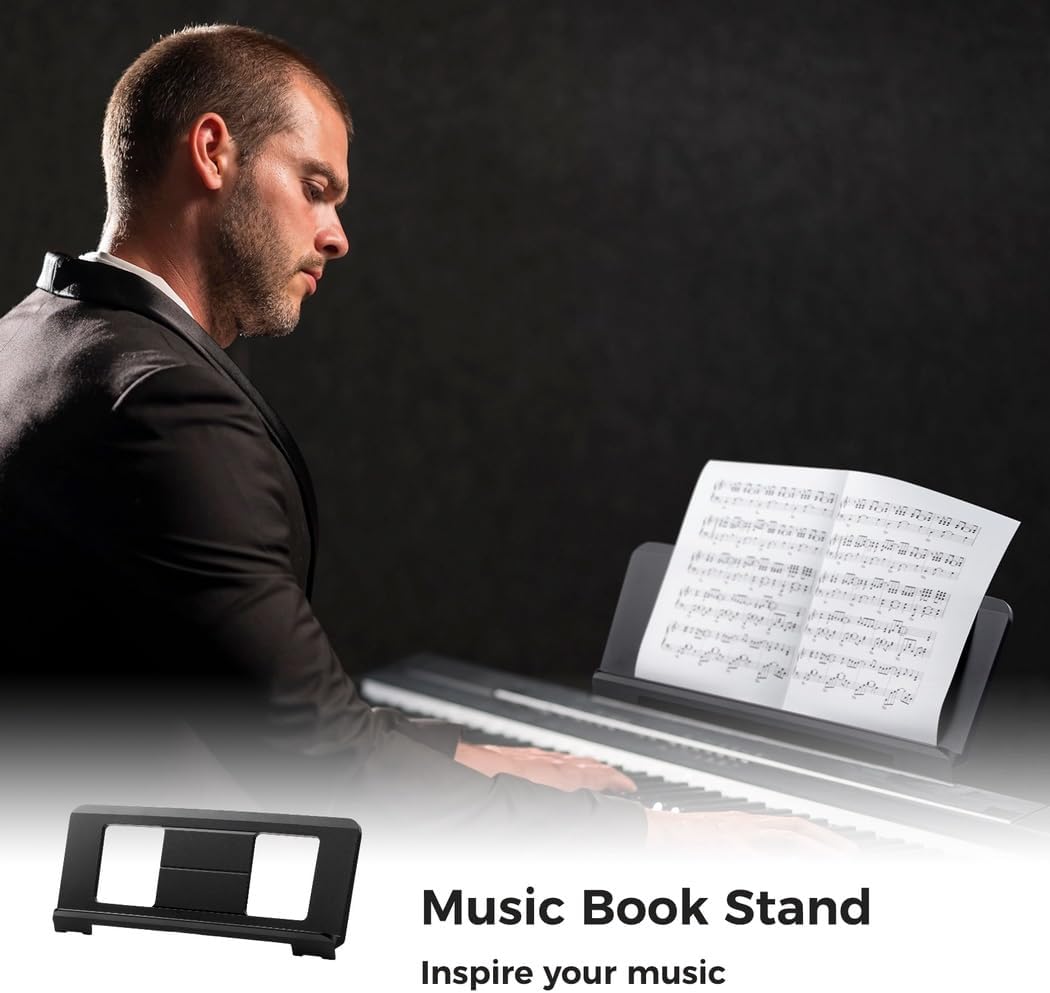 Color: black Material: plastic Product size: 19.5 x 8.3 inches Package Includes: piano stand x 1 Note: - Please refer to the measurement. Tiny measuring error is allowable in normal range. - There might be a little color difference due to the monitor, camera or other factors, please refer to the physical item.