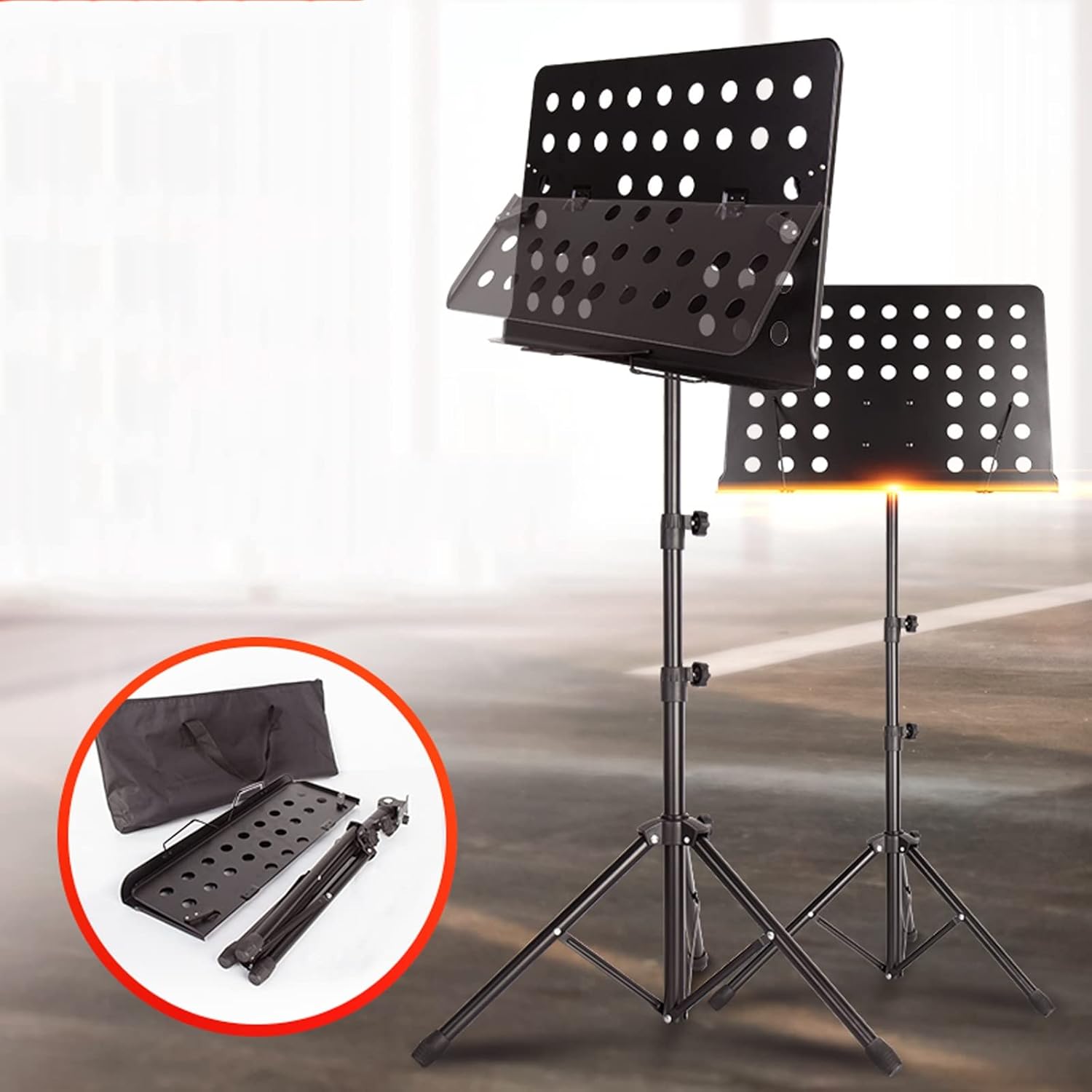 Name: Convenient Folding Music StandMaterial: metal ironProcess: paint frostedColour: Black Size: Adjustable 0.7-1.45cmFeatures: The side screw knob is stable and does not fall offApplicable: Carrying out, playing at home, suitable for concerts, churches, schools, orchestra performancesThe package includes:1x music stand1x sheet music bag