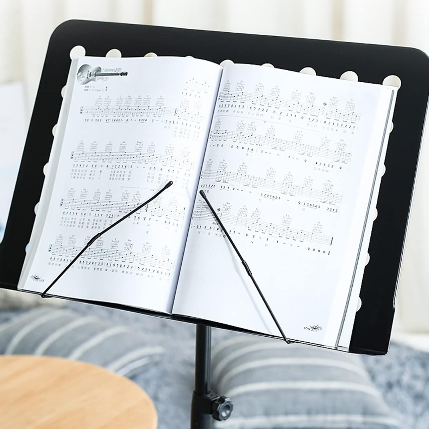 Name: Convenient Folding Music StandMaterial: metal paintProcess: high temperature electrostatic paint processColor: Black/BluePanel size: 50x35cmAdjustable height 80-160cmApplicable: Carrying out, playing at home, can be used in recording and arrangement, professional performing arts, training and teaching, home practice, etc.The package includes:1x music stand1x sheet music pack1x Spectrum Clip Light