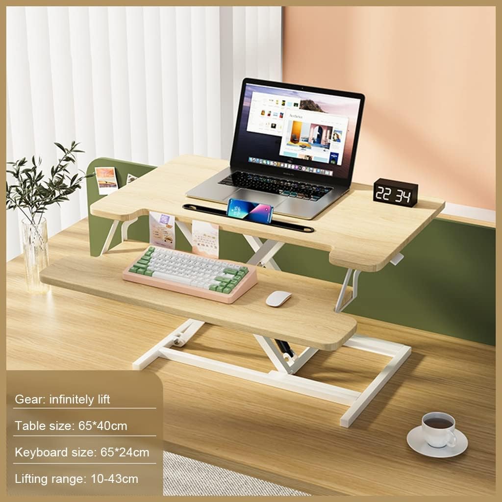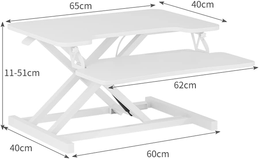 Portable desktop converter for changing between sitting and standing positions throughout the day. Convenient foldable design for easy storage and transport. Working with a riser can adjust posture,reduce back pain and increase productivity. Spacious Work Area Work Surface Size: 65 x 40cm / 25.6 x 15.7 inches Keyboard Tray Size: 65 x 24cm / 25.6 x 9.4 inches Height adjustment Range: 14 - 43cm / 5.5 in to 16.9 in Material: MDF board + steel frame Lifting method: side adjustment handle, that is, loose that stop Packing list. Converter x 1 Note: We only sell Converter, nothing else is included. Due to the display screen and photo lighting, the actual product may have color difference, please understand. If you have any questions, please feel to contact us, we will reply you ly. Your satisfaction is our greatest affirmation.