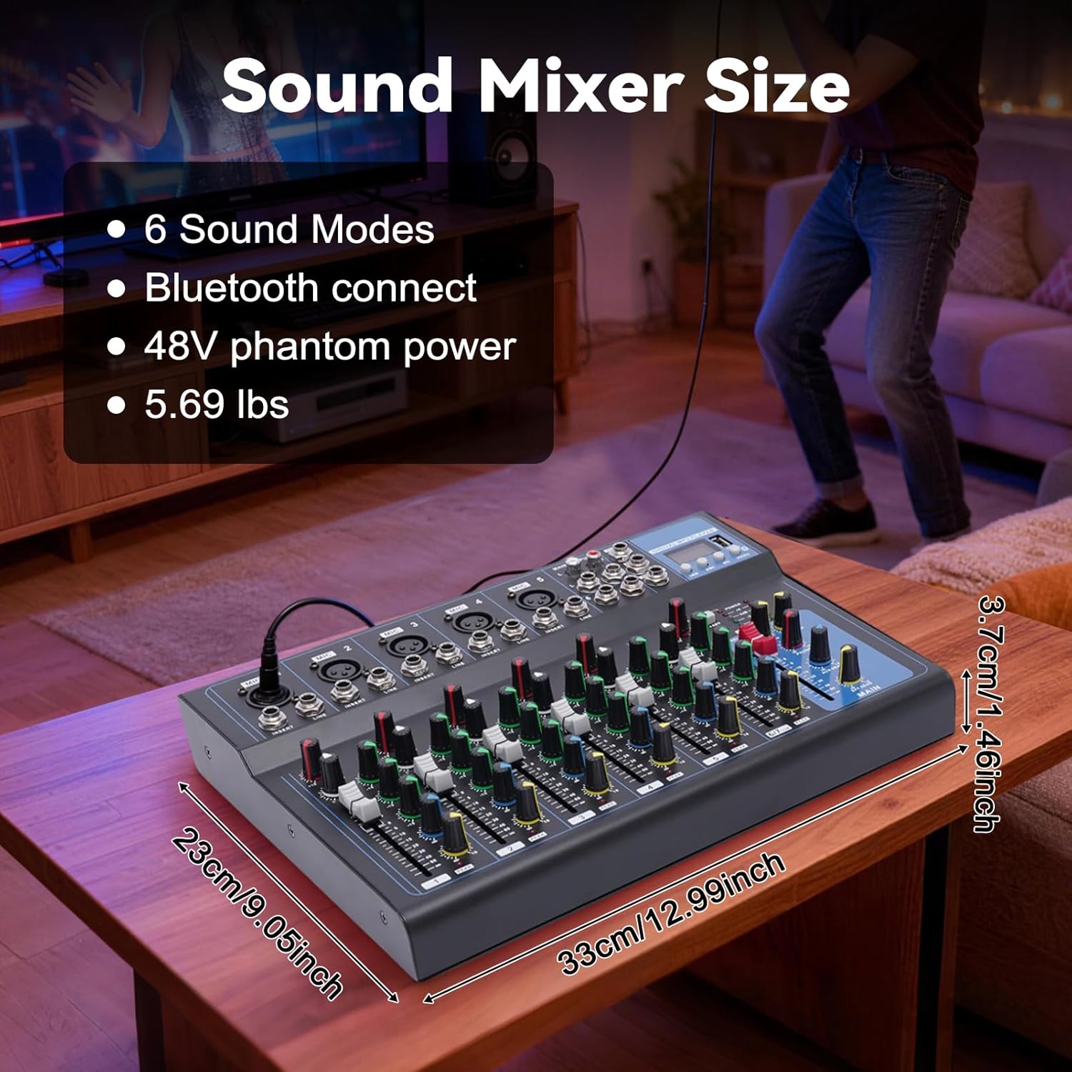 DetailsPower Connector: The CNC-polished power connector on the side of the body is not only solid and durable but also smoother to insert.Indicator Light: It is designed with an indicator light that shows you the work of each circuit, allowing you to tune more accurately.LCD Display: There is an LCD screen on this item that can real-time display system functions, which is easy for you to adjust.48V Phantom Power: It uses 48V phantom power to be able to use professional recording condenser microphones to create a professional-grade tuning experience for you.Multi-interface: Its various interfaces are well-made, have stable transmission, and have less distortion for you to bring better tuning effects.Damping Knob: Its tuning knobs with a damping design, feel comfortable, and free to tune!ApplicationThis 7-channel mixer supports the connection of wired devices, wireless devices, condenser microphones, etc. It is suitable for home KTV, campus presentations, conferences, stage performances, live performances, etc.SpecificationColor: BlackStyle: MinimalistMaterial: IronNumber of Channels: 7Connectivity Technology: Interface, USB, BluetoothPlug Voltage: U.S. Plug 110VMicrophone Maximum Input Level: +24dBuMaximum Line Input Level: +24dBuMaximum Output Level: +26dBuMain Level Meter: 5-segment Light-emitting DiodeFrequency Response: 20Hz - 20kHz ± 0.5dBCommon Mode Rejection Ratio (MIC 1KHz): >75dBTotal At-wave Distortion (THD+N): <0.01% (Channel Input to Mix Output)Crosstalk (1kHz): >85dBNoise (22Hz - 22KHz): Equivalent Input Noise -116dBu Residual Output Noise <-80dBuMono/Stereo Channel EQ: High Frequency, Broom Type, +/-15dB,12KHz Low frequency, Broom Type, +/-15dB,80KHz High/Midrange, Peak/Valley Type, +/-15dB,2.5KHzMono: XLR Balanced, 2-pin Hot end, 2Kohm Sensitivity -60 to +14dBu TRS Balanced, Tip Hot End 10Kohm Sensitivity -40 to +14dBu XLR Phantom Power +48VStereo: TRS Unbalanced, Tip Hot End 10Kohm Sensitivity -40 to +14dBuL/R Output: TRS, Unbalanced, Tip Hot End, <75ohm, -2dBu, +18dBu MaxFX/AUX Output: TRS, Unbalanced, Tip Hot End, <75ohm,-2dBu,+18dBu MaxHeadphones. TRS, tip L, Recommended for Headphones from 30 to 600ohmProduct Size: 33*23*3.7cm/ 12.99*9.05*1.46inPackage Size: 38*8*30cm/ 14.96*3.15*11.81inNet Weight: 2.58kg/ 5.69lbsGross Weight: 2.85kg/ 6.28lbsPackage Included1* 7 Channel Mixer1* Adaptor1* English User’s ManualNotesPlease allow the slight color difference caused by the shooting light and 1-3 cm error due to manual measurement, and make sure you do not mind before ordering.