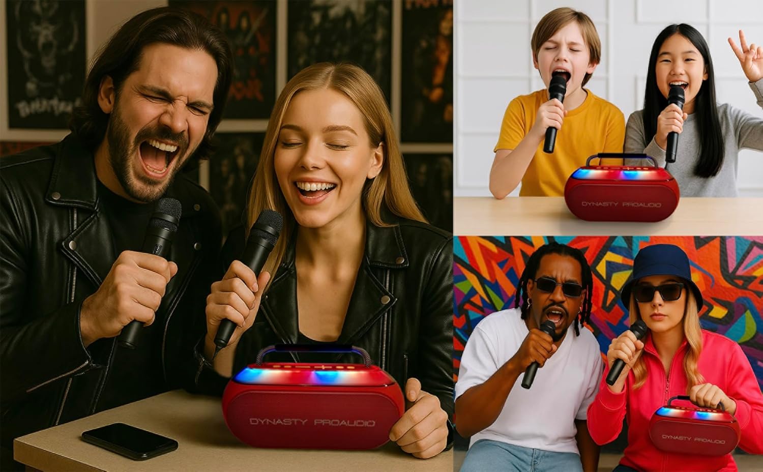 Dynasty ProAudio SB-230 Portable Bluetooth Speaker/Karaoke Machine with Two Wireless Microphones, Waterproof, Supports for USB, AUX, TF-Card, Color Change LED Lights (Red)