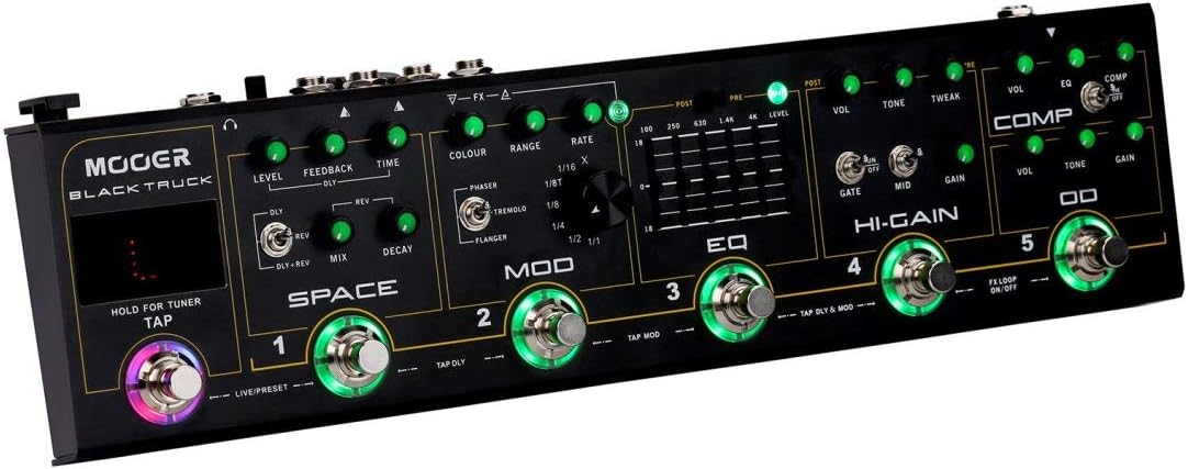 6 effects pedals built into 1 simple unit. Compressor, Overdrive, Distortion, EQ, modulation, Delay/Reverb. Full-featured controls for each effect. Built-in precision guitar tuner. Tap tempo synchronization. Integrated effects loop for connecting external pedals or 4 cable method connection with an amplifier.