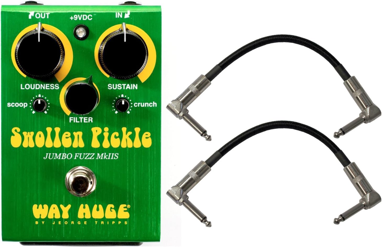 The Swollen Pickle Jumbo Fuzz MkIIS serves up the same burly high gain fuzz as the full-sized MkII but in a more petite package. With a twist of the Sustain control, youre taken from mild crunch to Armageddon! The Filter control retains its trademark insane range of heavily bandpass-filtered tones, distinguished by remarkable girth and sizzle, and the Loudness puts out enough volume to clobber any amp! The Scoop tone stack control elicits classic Swollen Pickle mid-scoop or a flat mid-frequency sweep, and the Crunch knob adjusts the compression intensity of the fuzz. Finally, under the hood, the MkIIS has two internal mini controls: Voice sets the intensity of the external scoop control from light to heavy mid cut, and Clip varies between two sets of clipping diodes for smooth or opened fuzz sustain.