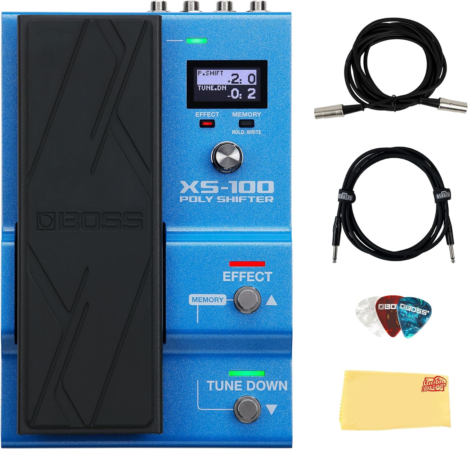 The BOSS XS-100 Poly Shifter is a flagship pedal that sets new standards in polyphonic pitch-shifting, delivering unmatched flexibility and pristine audio quality while preserving your instrument’s natural tone and feel. With 30 onboard memories, intuitive controls, and a built-in expression pedal, it offers effortless real-time pitch control for both single notes and chords. A backlit LCD ensures easy navigation, while comprehensive connectivity, including MIDI, USB, and multiple I/O options, makes it a seamless fit for any modern rig. Ruggedly built for stage or studio, the XS-100 is more than just a pitch pedal, it’s a creative powerhouse designed to inspire and expand your musical possibilities. AD Conversion: 24 bits + Adaptive Focus methodDA Conversion: 32 bitsSampling Frequency: 48 kHzMemories: 30Nominal Input Level: -10 dBuMaximum Input Level: +7 dBuInput Impedance: 2.2 MΩNominal Output Level: -10 dBuMaximum Output Level: +7 dBuBypass: Buffered bypassControls: EFFECT switch, TUNE DOWN switch, SELECT knob, EFFECT button, MEMORY button, EXP1 pedalDisplay: Graphic LCD (64 × 32 dots, backlit)Dimensions: 147(W)×230(D)×72(H) mm; maximum height 96 mmWeight: 1.7 kg/3 lbs 12 ozAccessories: AC adaptor, leaflet, 4 rubber feet Austin Bazaar bundles your purchase with essential accessories. This bundle includes a power supply and an instrument cable for reliable connectivity, a MIDI cable for easy digital instrument control and synchronization, picks for future use, and an Austin Bazaar polishing cloth to keep your gear in mint condition.