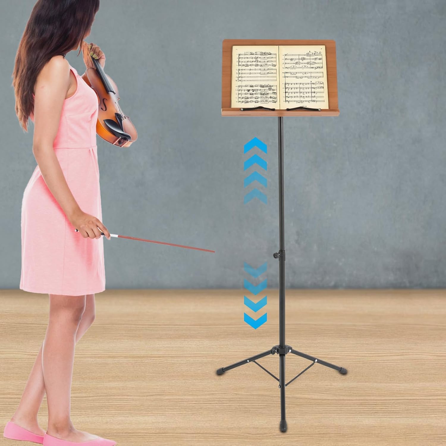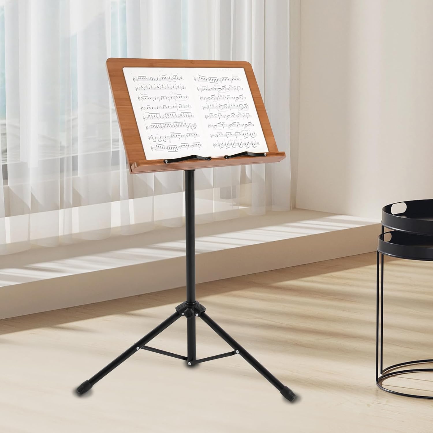 Details Fixing Bracket: The fixing bracket with a rubber sleeve can fix the sheet music while preventing scratching the sheet music, which brings you a better user experience.Anti-slip Feet: The three anti-slip feet at the bottom make the product fit the ground well, so it is stable and safe to use while preventing the floor from being scratched. Round Corners: They not only make the product more aesthetically pleasing to display but also enhance safety in use. ApplicationIt is suitable for sheet music for a wide range of instruments such as guitar, violin, erhu, and guzheng, as well as for a wide range of performance situations such as orchestras, concerts, choirs, and soloists.SpecificationMaterial: Metal, BambooColor: Black, BrownSurface Treatment: PaintingStyle: ModernAssembly Required: YesMounting Type: Floor StandingSheet Music Board Size: 39*29cm/15.35*11.42inAdjustable Angle of Sheet Music Board: 180°Adjustable Height of Support Frame:70-190cm/27.56-74.8inMax. Load Capacity: About 3kg/6.61lbsGross Weight: 3kg/6.61lbsNet Weight: 2.5kg/5.51lbsPackage Size: 73.5*40*8.4cm/28.94*15.75*3.31inPackage Included1* Sheet Music StandAll Accessories for InstallationNotes1. Please note that this product does not contain any sheet music.2. For better results, we recommend that you use it on a flat, smooth surface. We do not recommend that you use it outdoors in windy weather.3. Please allow the slight color difference caused by the shooting light and 1-3cm error due to manual measurement. Please make sure you do not mind before you order.