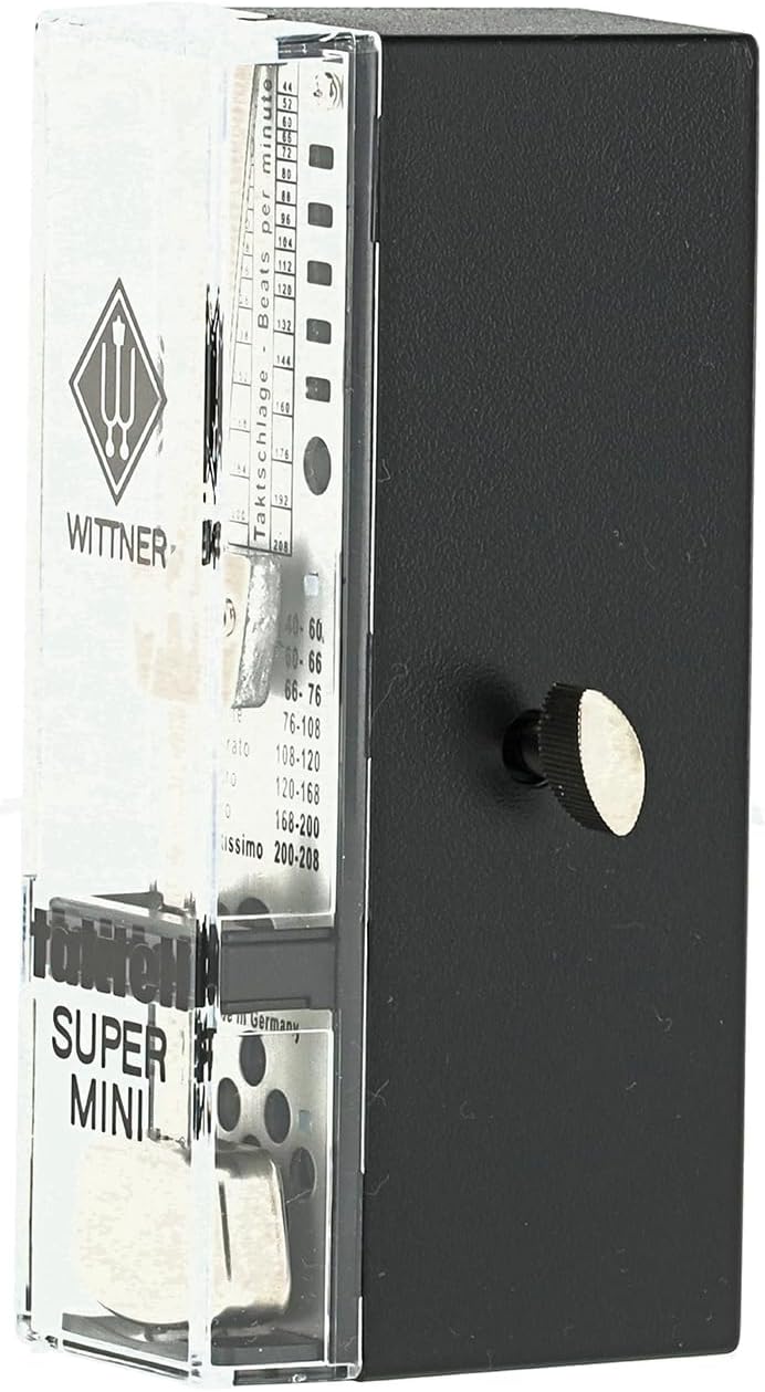 WITTNER Metronome taktell SUPER-MINI. Color: Black. Dimension of Metronome 1.14x1.93x4.09inches. Spring driven traditional metronome. Tempo range is from 40 beats per minute to 208 beats. Precision-made with nice black finish. One of the world's smallest pendulum metronome.
