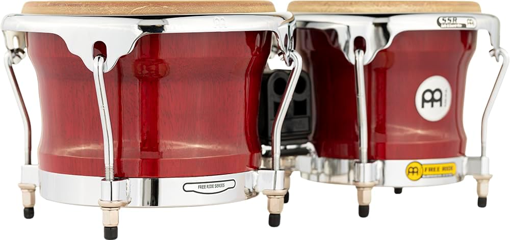 The MEINL FWB400 Professional Series Free Ride Wood Bongos are outfitted with exclusive MEINL hardware and are the preferred model among many top percussionists . The MEINL patented Free Ride Suspension System means the drums are joined together with no holes drilled in the shells. This maximizes the amount of resonance and warm tones that the Rubber Wood is known for producing. All MEINL bongo stands and mounts are equipped to securely hold the Free Ride mounting system in place. Professional Series Wood bongos are equipped with True Skin cow heads that have exceptional sound qualities. Included is a tuning key, accessory pouch and tune up oil. Paired with any MEINL Congas, these bongos are a great start or finish to your percussion set up! The Meinl Professional Bongo Stand (Model# TMB-S) for seated players will also allow you to comfortably set these up with your drum kit.