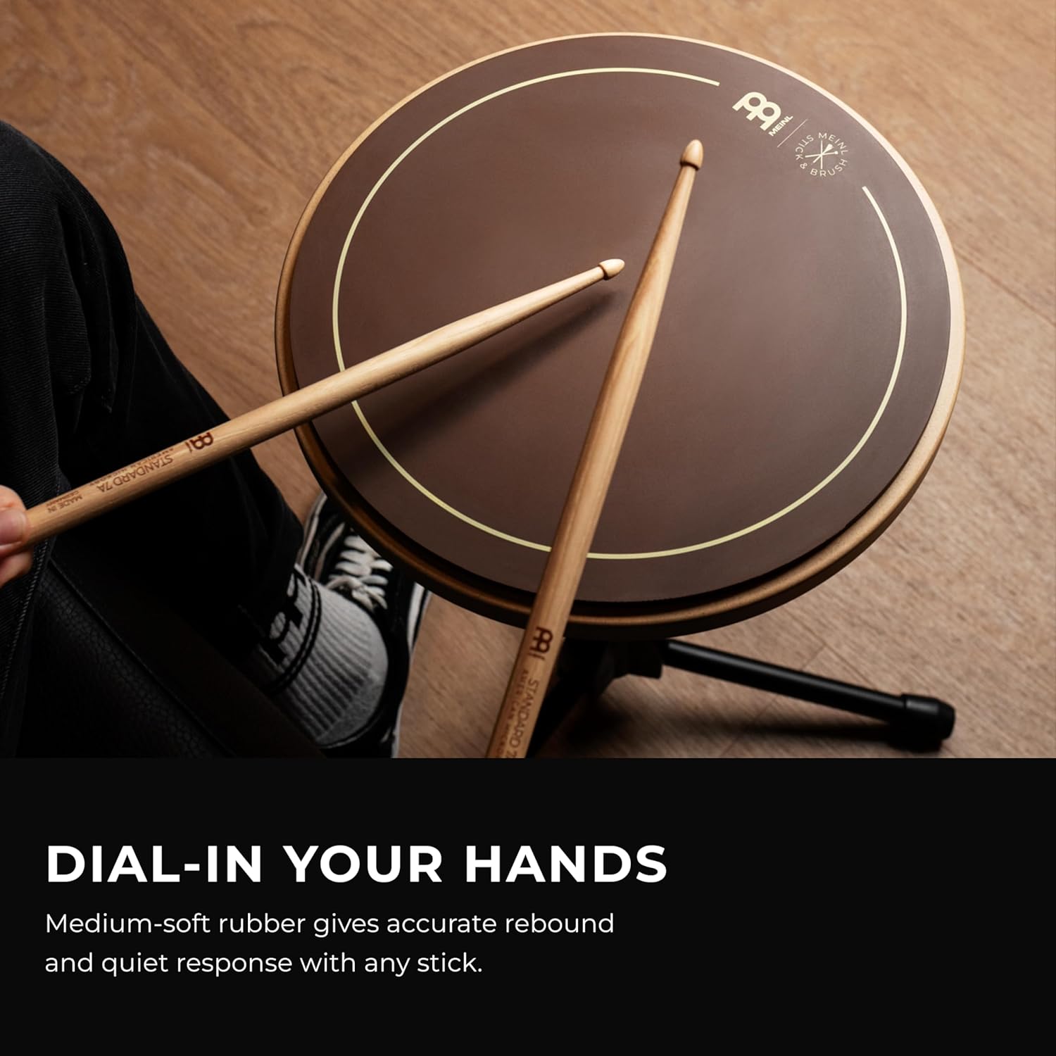 Meinl Stick & Brush Practice Pads are all-purpose pads with a medium-soft 6.5 mm gum rubber surface—enough rebound to feel like a drum, enough resistance to build chops. Quiet, but clear enough to hear every note. A rugged 18.5 mm modern composite base adds durability and weight. Inset threaded connection underneath mounts to cymbal stands (8 mm thread). The 6" pad is perfect for travel, and the 12" version fits snare basket stands. A 2 mm foam backing lets you play on any surface.