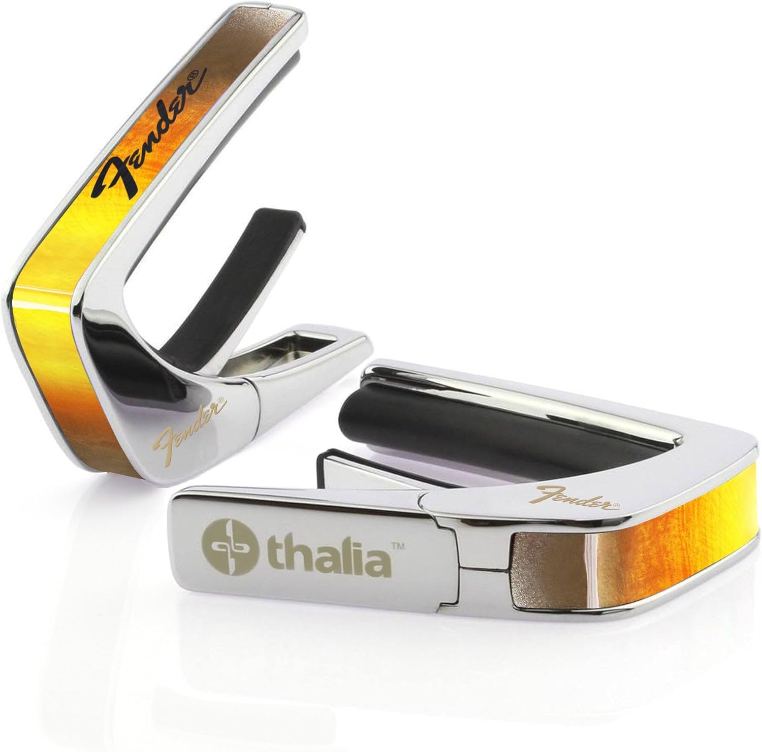 A Perfect Fit for Fenders of All Styles and Eras Thalia’s Fender officially licensed capos ideally complement your cherished Fender guitar, whether it be a vintage-style Strat, a powerhouse modern Tele, or even a Fender acoustic. These capos brandish classic Fender designs inspired by the brand’s iconic logos and finishes, and they’re by no means a mere cosmetic makeover of your standard Thalia capo! What sets them apart? A trio of Thalia’s Standard Tension OctaveTouch fret pads that cover Fender’s historic vintage 7.25-inch radius, Fender’s modern 9.5-inch radius, and the flat 12-inch radius found on several of Fender’s high-performance 6-strings and acoustics. By matching the radius of the capo’s fret pad to your fingerboard radius, Thalia’s Fender officially licensed capos apply the optimal amount of pressure to each string, preserving your guitar’s tuning and requiring minimal (if any!) tuning adjustment. Moreover, these capos also deliver a superlative degree of functionality