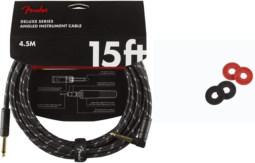 Fender Deluxe Series Instrument Cable, Straight/Angle, Black Tweed, 15ftFender deluxe Series cables carry the highest quality materials and braided shielding to deliver flagship durability, conductance and transparency. Our top-of-the-line cables sport custom molded ends with strain relief under the housings 24K gold-plated connectors that won’t tarnish or degrade your sound over time. These cables use a very quiet braided shielding that is engineered to maximize the purity of your tone, and they're protected by a soft-woven yet rugged tweed jacket that provides ultimate protection with classic Fender style.Fender Deluxe Series Instrument Cable, Straight/Angle, Tweed, 15ftFender deluxe Series cables carry the highest quality materials and braided shielding to deliver flagship durability, conductance and transparency. Our top-of-the-line cables sport custom molded ends with strain relief under the housings 24K gold-plated connectors that won’t tarnish or degrade your sound over time. These cables use a very quiet braided shielding that is engineered to maximize the purity of your tone, and they're protected by a soft-woven yet rugged tweed jacket that provides ultimate protection with classic Fender style.