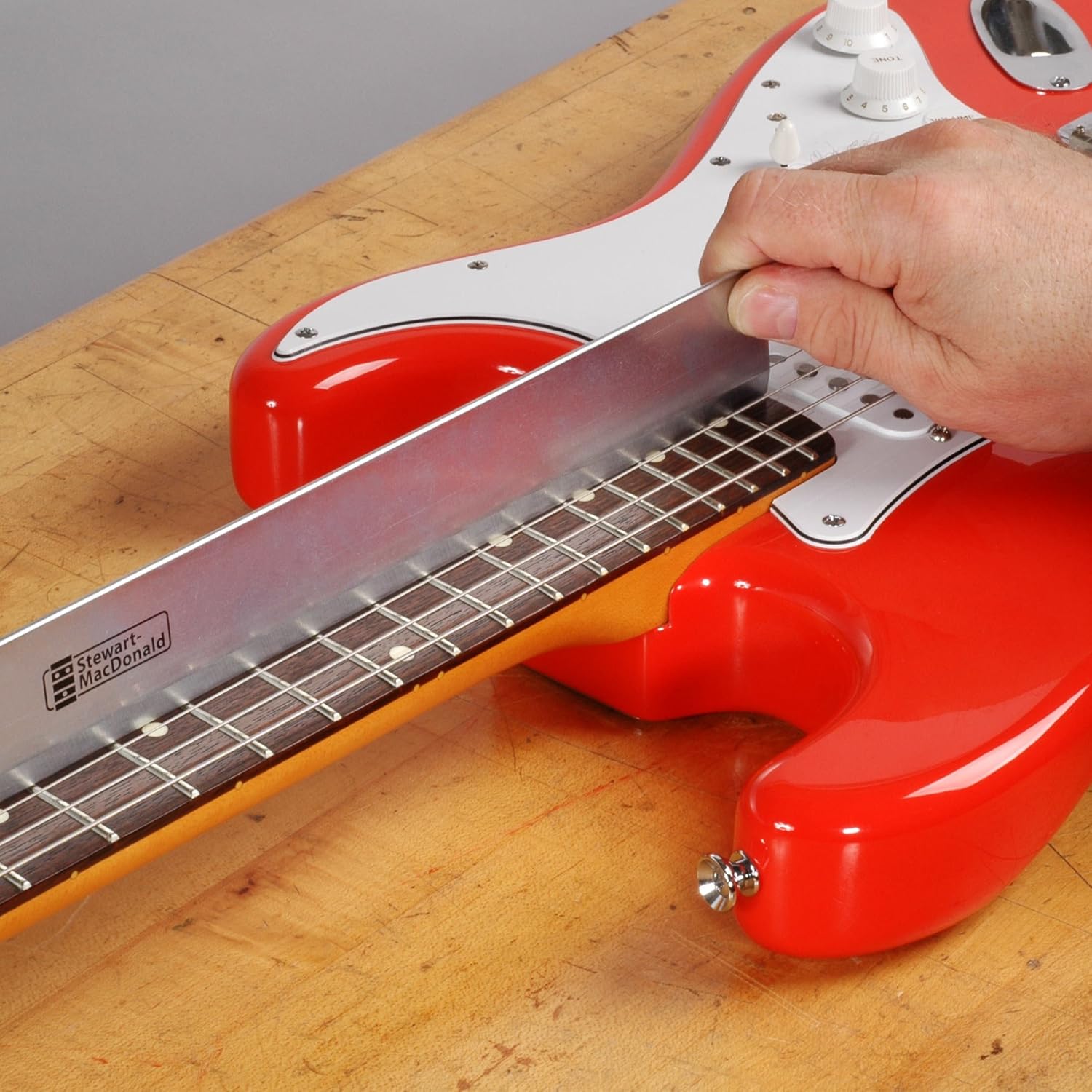 The StewMac Precision Straightedges are the gold standard for guitar neck and fret evaluation, ensuring accuracy for truss rod adjustments, fret leveling, and neck relief checks. Designed for professional luthiers and repair technicians, these straightedges provide unparalleled precision and durability.Crafted from ultra-high-grade stainless steel, each straightedge features a satin finish for improved visibility and the ability to mark measurements with a pencil. The narrow beveled edge allows for precise gap inspection, making it easy to detect uneven frets and neck imperfections. Guaranteed to ±.0015" per foot accuracy, these tools are trusted for professional guitar setups.Available in four sizes to accommodate different instruments and applications:#3849 - 12" x 1.5" x 0.079" (304mm x 38.1mm x 2mm) – Ideal for mandolins, ukuleles, and short-scale instruments#3850 - 18" x 1.5" x 0.079" (457mm x 38.1mm x 2mm) – Great for guitars and part of the Basic Setup Kit#3799 - 24" x 1.6" x 0.118" (609mm x 40.6mm x 3mm) – Designed for acoustic and electric guitars, compatible with the Neck Set Gauge#3800 - 36" x 1.6" x 0.118" (914mm x 40.6mm x 3mm) – Perfect for bass guitars and long-scale instrumentsEach straightedge undergoes a rigorous 13-step manufacturing process and is individually inspected to ensure maximum precision. Unlike aluminum alternatives, these tools resist bending and denting, ensuring reliable performance for years to come.Perfect for luthiers, DIY musicians, and even precision woodworking, the StewMac Precision Straightedges deliver professional results in every setup.