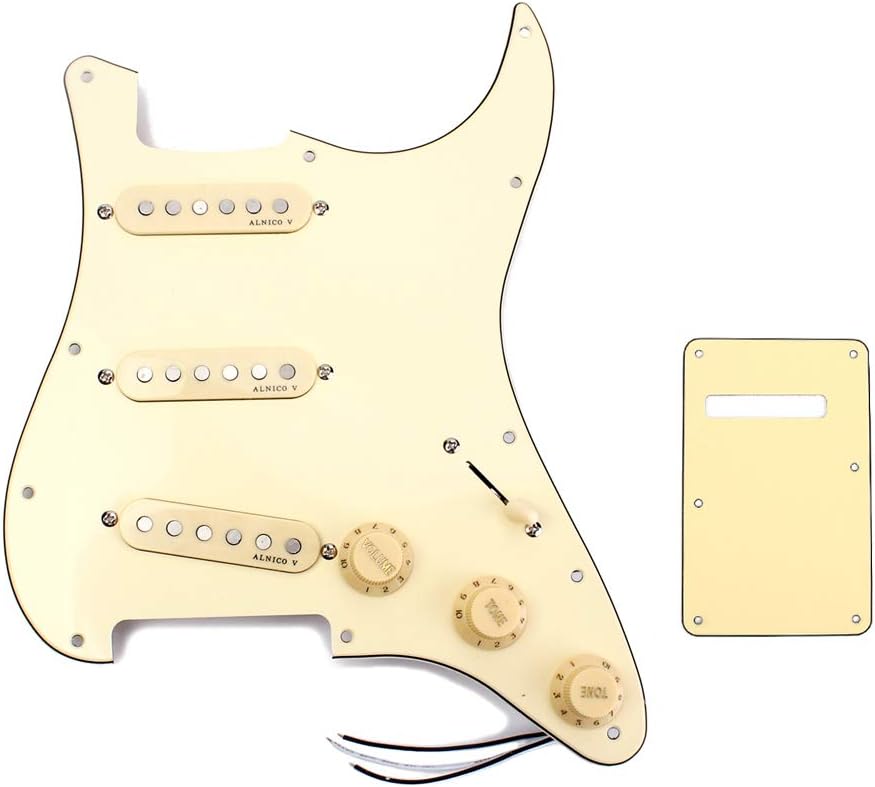 Specifications: - Material: Copper, Plastic, Alnico - Color: Cream - Clear bobbins,Pickups Resistance: Neck 7.4K;Middle 8.6K;Bridge 9K. - Pickups Pole Spacing: 50mm (Neck); 50mm(Middle); 52mm(Bridge) - ️2T1V control knobs,two A250k pots for tone,B250k pot for volume. - ️5-way switch and 223J 600v capacitor. - Size: Approx. 28.3 x 22.5 x 0.22 cm (L x W x H). Package Included: 1 x Loaded Pickguard 11 x Pickguard Screws