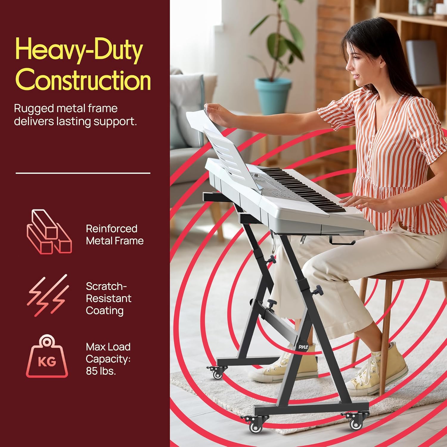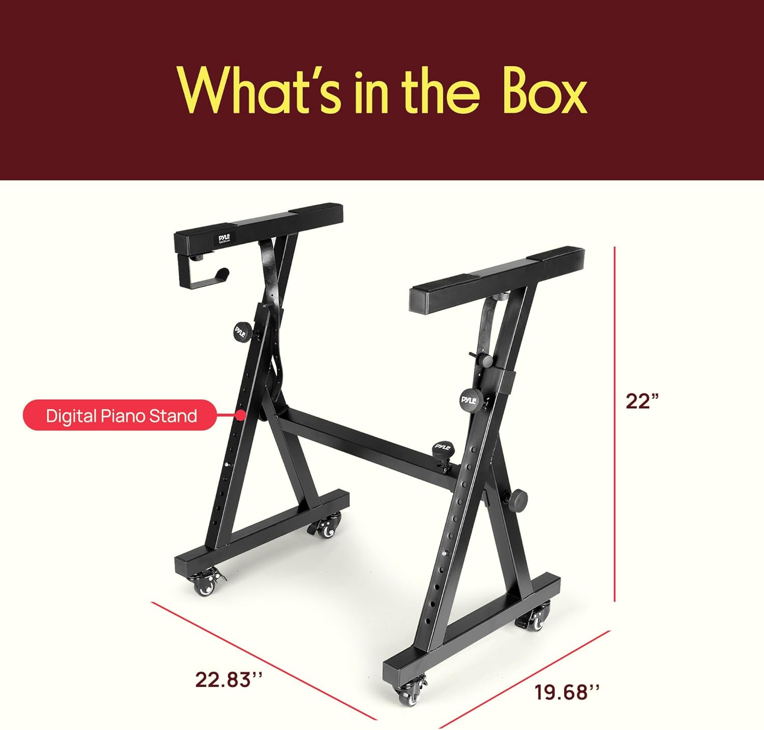 Features: - Safe & Reliable Keyboard Placement - Rugged & Durable Metal Construction - Quick & Convenient Height Adjustment - Secure Stability-Lock Mechanism for Reliability - Unique Z-Design for Maximum Stability - Works with Digital/Electronic Piano Keyboards - Perfect for Seated or Standing Performances - Folding Design for Travel and Storage - Glossy Black Finish - Locking Wheels - Knob Bolts for quick & Convenient Height Adjustment - Easily to Set Up or Adjust Height & Width of the Stand - Includes Wheels for Transport & Home Use What's in the Box: - Digital Piano Stand Technical Specs: - Adjustable Height with Wheels Attached: 22'' x 35.4'' -inches - Adjustable Width with Wheels Attached: 22.8'' x 39.8'' -inches - Construction Material: Steel - Minimum Height: 22'' -inches - Maximum Height: 35.4'' –inches - Maximum Weight Load Capacity: 85 lbs. - Folded / Closed Dimensions (L x W x H): 21’’ x 2.6’’ x 20.7’’ -inches - Open / Extended Dimensions (L x W x H): 19.68’’ x 22.83’’ – 39.76’’ x 22’’ – 35.4’’ - inches
