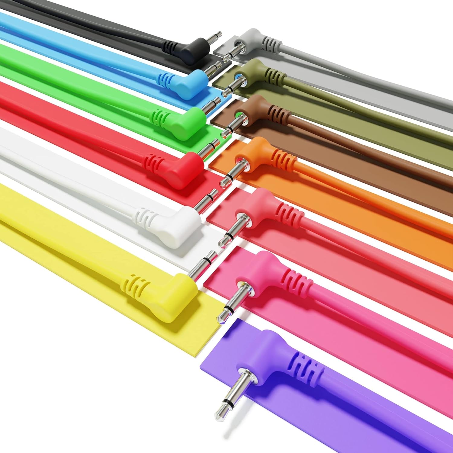 ExcelValley - Right Angle Mono Modular Patch Cables TS 3.5mm 1/8 inch Eurorack SynthesizerSuitable for your Eurorack modular synthesizer, or other general patching duties, where a mono 3.5mm cable is needed.This kind of Modular Patch Cables are 1/8" TS patch cables with molded ends for exceptional durability. Available in a variety of lengths and colors, perfect for keeping track of your CV, gate and audio signals.FeaturesSet of multiple pieces, different colors & 1 lengthOnly 13mm high when patchedFully molded patch cables constructed of 26AWG stranded copper wire99.99% pure and oxygen free copperNickel plated connectors provide high corrosion protectionFlexible strain reliefCompatible with: Roland, Moog, Doepfer, Arturia, KorgSpecificationsConnectors: 2 x TS 3.5 mm (1/8" - 1/8 inch)Analog Mono - UnbalancedRight Angle Jack - MaleType: Mono Patch CablesGauge: 26 AWG - American Wire GaugeCable length (Options):10 cm - 3.94 inch - 0.33 feet15 cm - 5.91 inch - 0.49 feet20 cm - 7.87 inch - 0.66 feet30 cm - 11.81 inch - 0.98 feet45 cm - 17.72 inch - 1.48 feet60 cm - 23.62 inch - 1.97 feet90 cm - 35.43 inch - 2.95 feet120 cm - 47.24 inch - 3.94 feet150 cm - 59.06 inch - 4.92 feet180 cm - 70.87 inch - 5.91 feet200 cm - 78.74 inch - 6.56 feetPackage (Options):6A-Pack - 6 pieces: Black, Blue, Green, Red, White, Yellow6B-Pack - 6 pieces: Army Green, Brown, Orange, Peach, Pink, Purple10-Pack - 10 pieces: 6A-Pack + Orange, Peach, Pink, Purple12-Pack - 12 pieces: 10-Pack + Army Green, Brown13-Pack - 13 pieces: 12-Pack + Grey