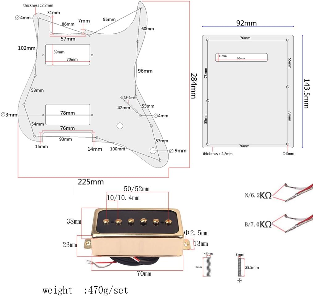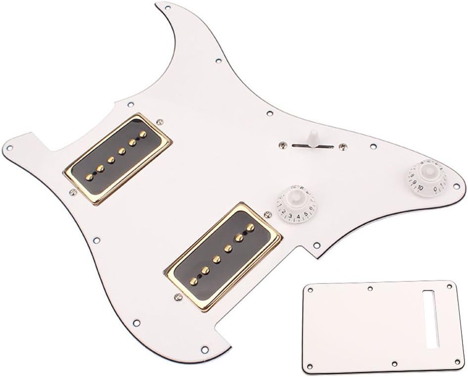 Description: - (-white) HH pickguard 11 mounting holes guard loaded with 2 s - Suitable for electric guitar or other guitars with similar size - Neck pickup: 6.2k; Bridge pickup: 7.0k. - Material : PVC and - Color: WhitePackage Includes:A Loaded HH PickguardA Backplate18 Screws