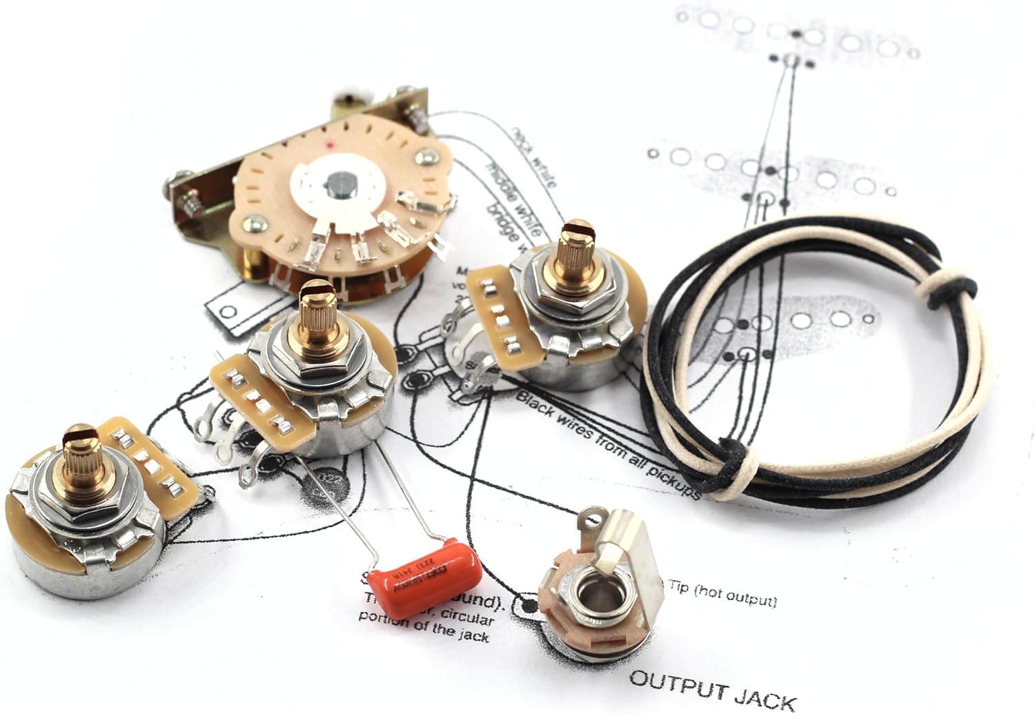 TAOT Deluxe Wiring Kit for Fender Stratocaster w/ Wiring Diagram. Featuring CTS high quality 450G series potentiometers designed specifically for guitars. 1/4" high X 3/8" diameter bushing Pots require 3/8" mounting hole. All parts in the kit are high quality USA sized parts and are not compatible with import guitars using metric sizing.