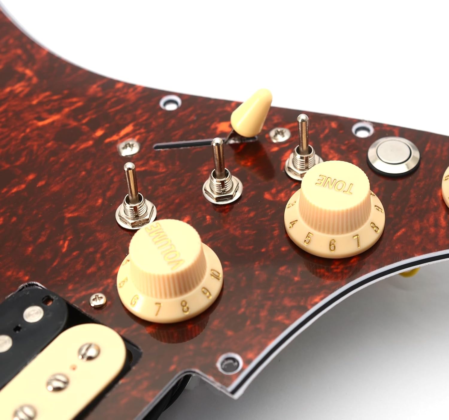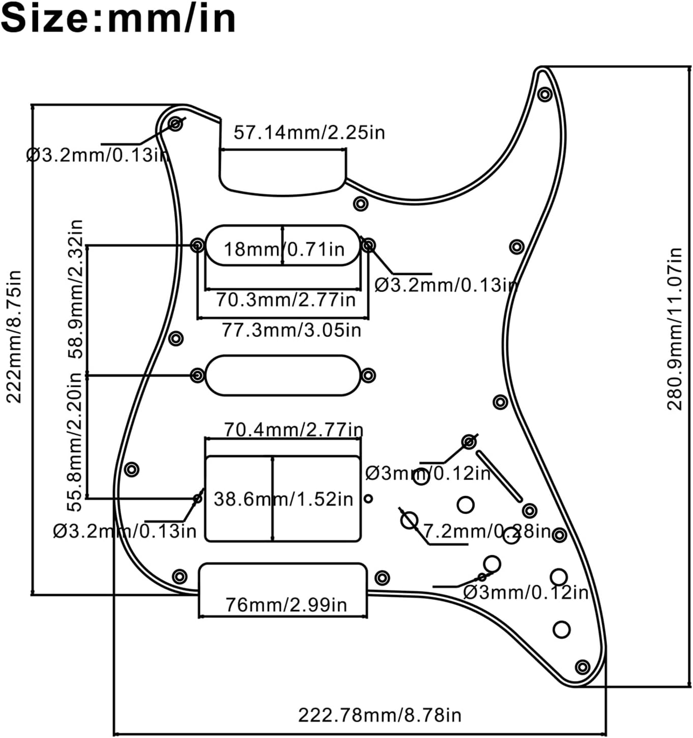 Description:100% Brand new, never usedItem 100% like the picture shownPickguard and Two Mini Humbucker + one HumbuckerSwitch is a 5 way switch and the wiring is one volume and two tone controlsWith three 2 way on/on switch, can Coil Split the pickupWith Silence SwitchMagnet: Ceramic.D.C. Resistance:Neck and Middle: 9K (splitting coil 4.5K)Bridge: 15K (splitting coil 7.5K)Four conductor wires,Black wire is hot, green wire is ground, red and white is for splitting coil11 screw holesAs with any pickguard, some modification may be necessary for exact hole alignment, as there are many different hole patterns.Material: PVC Pickguard and Copper Coil PickupPickguard Colour: 3 ply PVC, white or Black, please select the one you needPackage Include:1 x Guitar Loaded PickguardNote: Due to the difference between different monitors, the picture may not reflect the actual color of the item. Thank you!