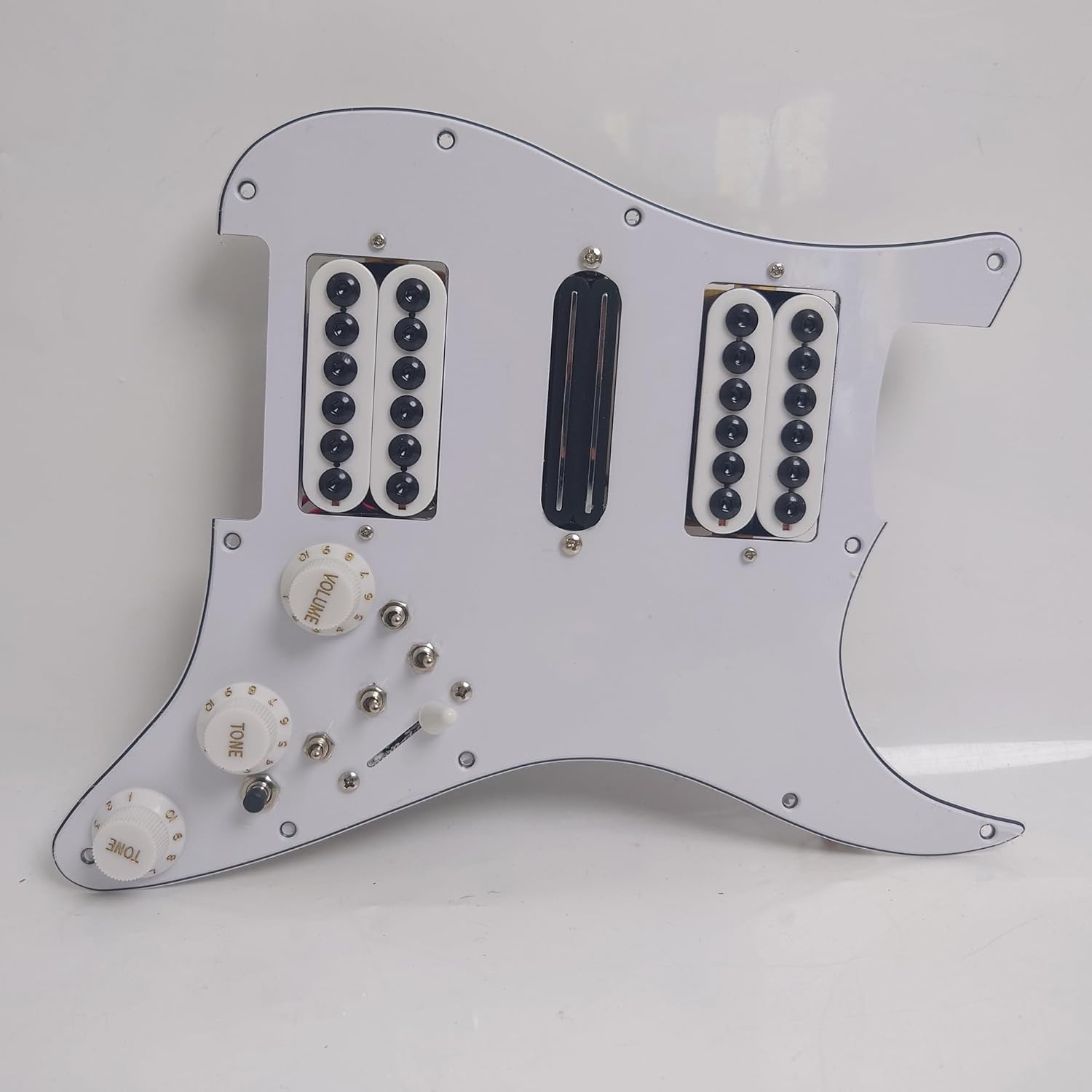 The surface of the product is covered with a film to prevent scratches and damage. Please remove the film before installing the product on the guitar. Specifications: Material: Metal, plastic, copper, magnets Resistance: N/M/B: 7.5Kohm/9.18Kohm/ 15Kohm (K resistance is for reference only, which will change as the temperature changes) Hole Distance: N/M/B: 50mm/52mm/52mm Hand:Right-hand Weight: 700g/1.54lb Package include: 1X 3-ply Guitar Pickguard 2X Invader humbucker pickups 1X Mni humbucker pickup 2x Chrome pickup cover mounting ring 1X 5-way switch 1 x Enhanced switch 3X Potentiometer 1V2T 4X Cut Single Toggle 1X 473K Caps (Made in USA) 1X 333K Caps (Made in USA) 1X Output Jack 11x Screws In addition to the original function,the four single-cut toggle and one enhanced switch bring new functions, as follows: 1.When the 5-speed switch is placed in the first position, the neck pickups work. After pressing the enhanced switch at this time, neck + bridge pickups will work at the same time. 2.When the 5- speed switch is in the second position, the neck + middle pickups work together, pressing the enhanced function switch at this time, neck + middle + bridge pickups will work at the same time. 3.Each pickup has an independent single-cut (Push-Pull) switch. After turning on the single-cut switch, If the sound of single cut is not good, it will be better to use compensation switch.