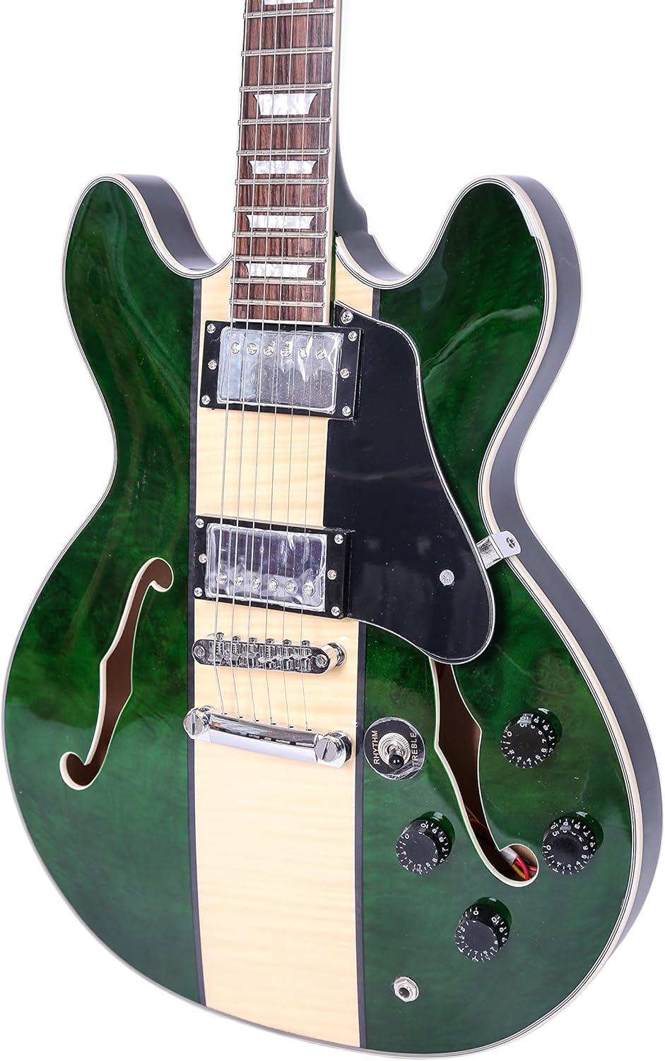 Semi-Hollow Body Electric Guitar,Maple Body and Neck,Rosewood Fingerboard,22Frets,Right-Handed,Flame Stripes with Tree Burl Pattern,Green