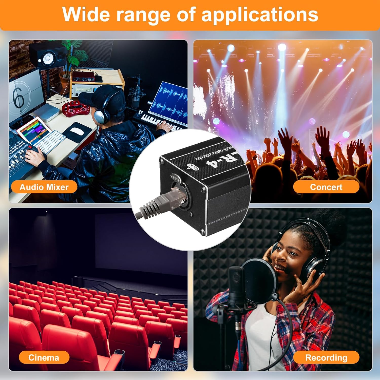 Features: The 4 channel XLR to RJ45 multi network snake receiver is compatible with digital mixers, consoles, junction boxes, and more, offering a space efficient solution for remote production. It enables sending and receiving up to four audio signals over a single CAT5, CAT5e, or CAT6 cable, offering a convenient alternative to bulky multi channel audio. The XLR snake for lighting and recording set provides a speedy deployment system for shows and live events. It can be paired with a cable reel for quick and efficient network cable management, thereby solving potential issues with live or recorded sound setups. Specifications: Main material: aluminium alloy Main color: XLR extenders: black Connection cable plug: colorful Size: XLR extenders: about 3.6 x 1.5 x 2 inches Connection cables: about 3.3 ft long Package includes: 2 x XLR snake box male extenders 2 x XLR snake box female extenders 16 x Connection cables Notes: Manual measurement, please allow slight errors on size. The color may exist a slight difference due to different screen displays. Not dust proof or waterproof. Please protect your equipment when the weather is severe outside.