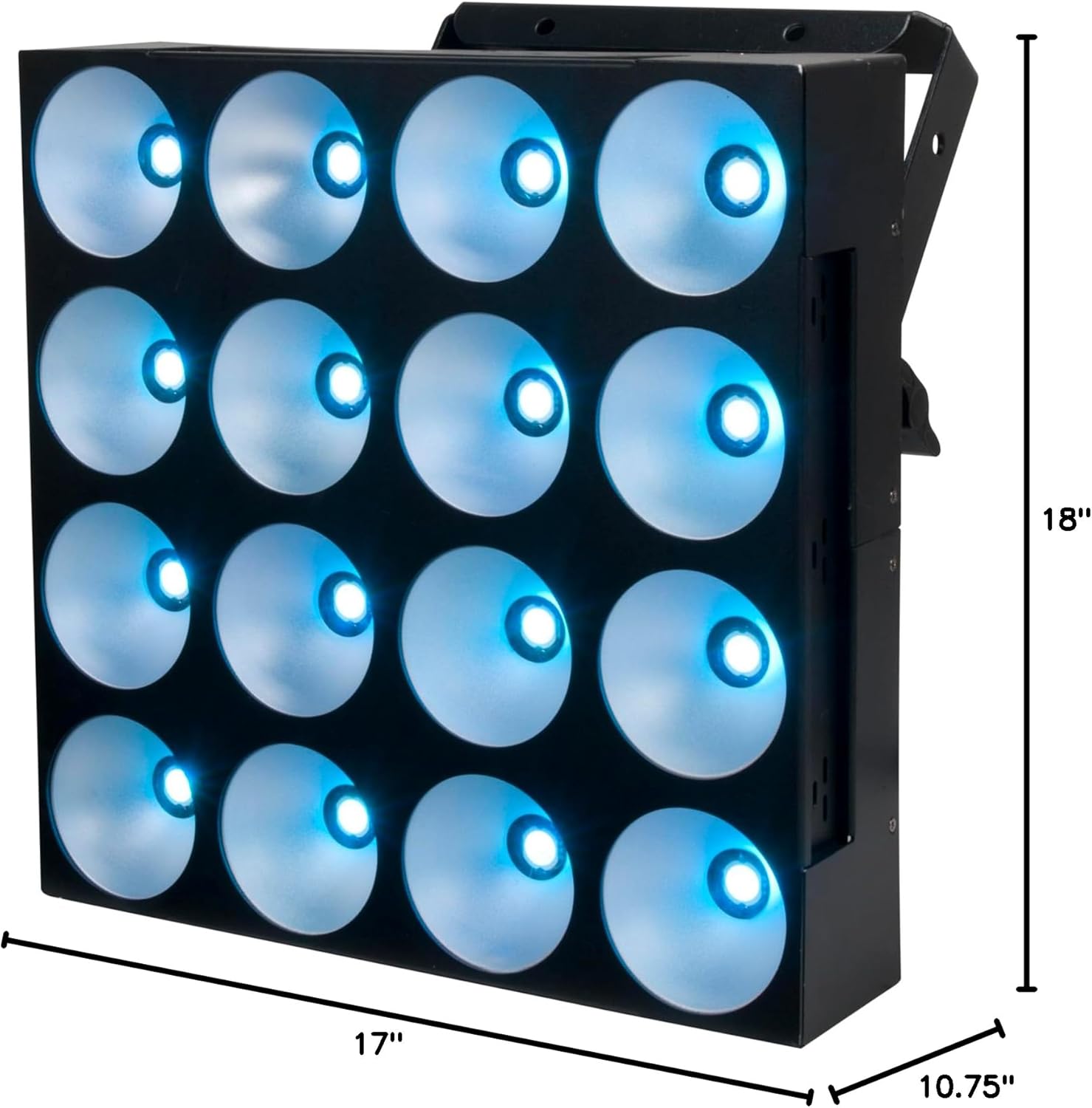 The Dotz Matrix from ADJ Products is a widely versatile lighting fixture that creates powerful hues of RGB color in a variety of color mixing options. Create 60-degree washes, generate strobe effects, create matrix patterns and control each pixel individually for a stunning Light Show. Manual and DMX Controllable across four channels, this unit does it all! Lightweight and easy to mount, this impressive unit is perfect for DJs, Light Shows, stage production and a wide array of applications.