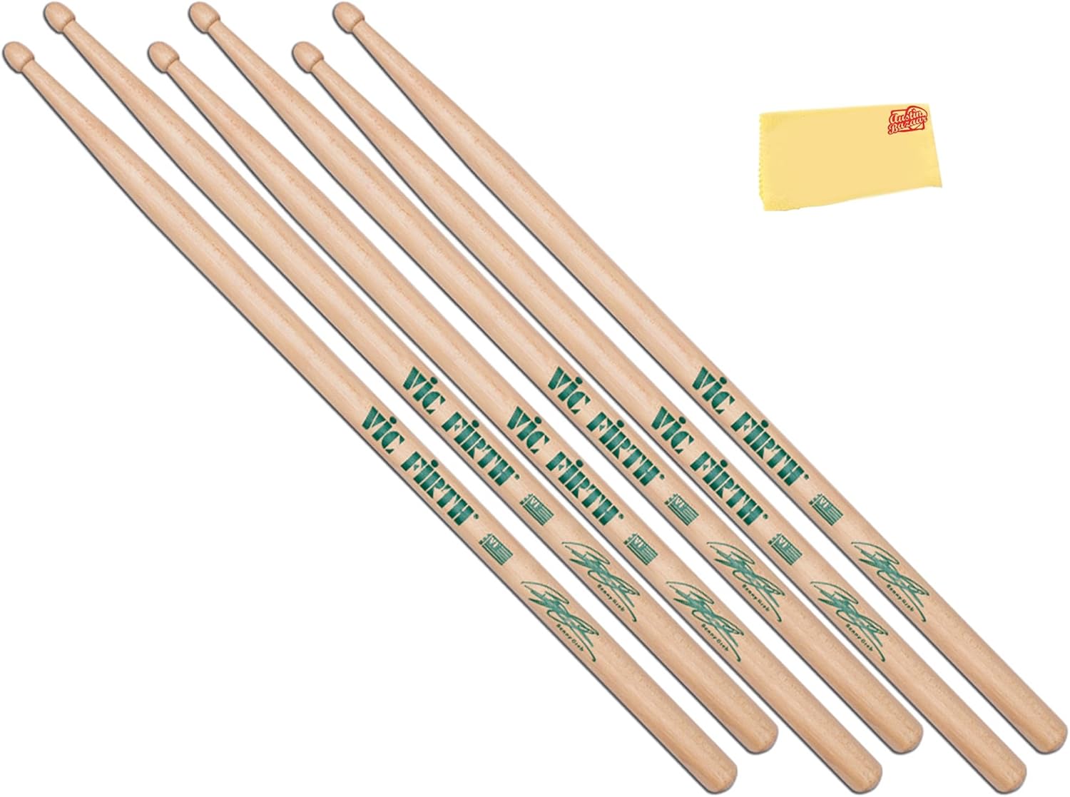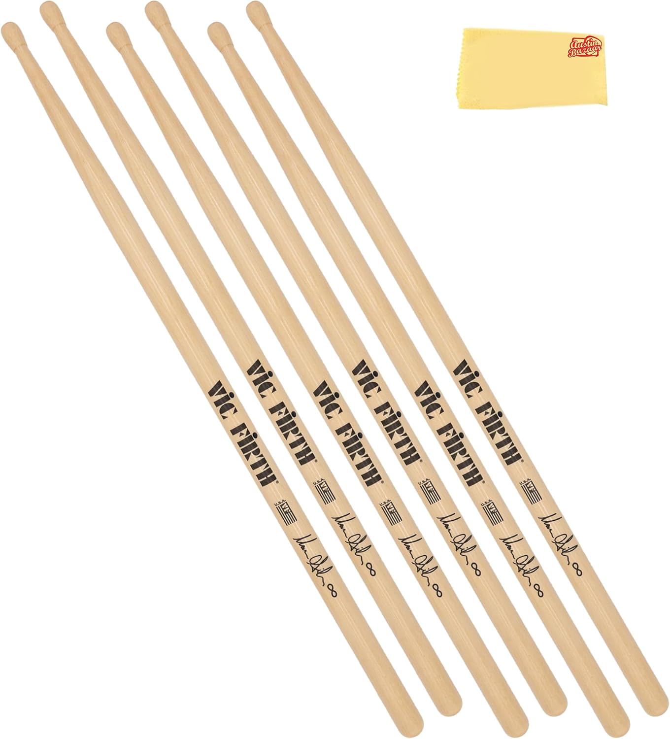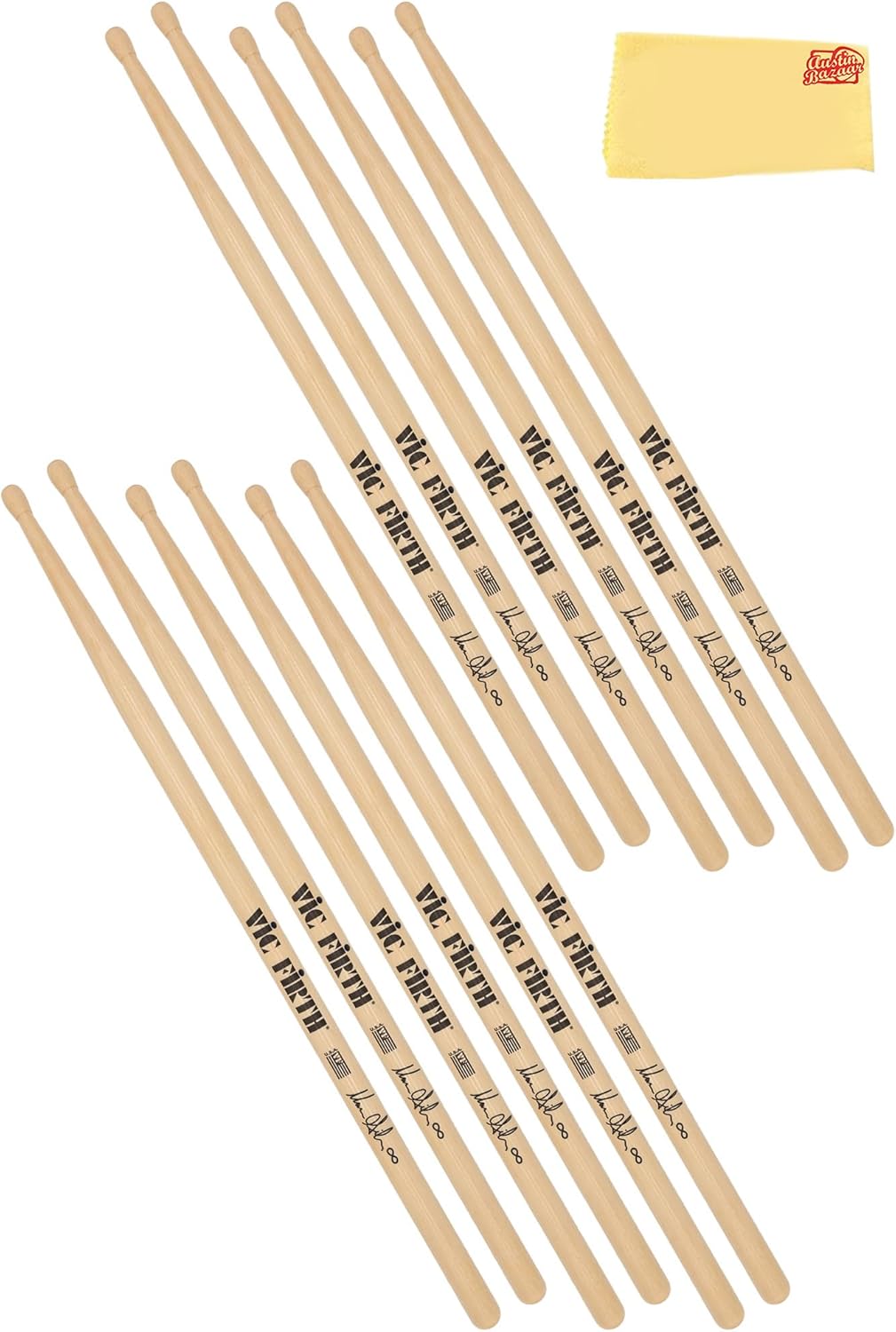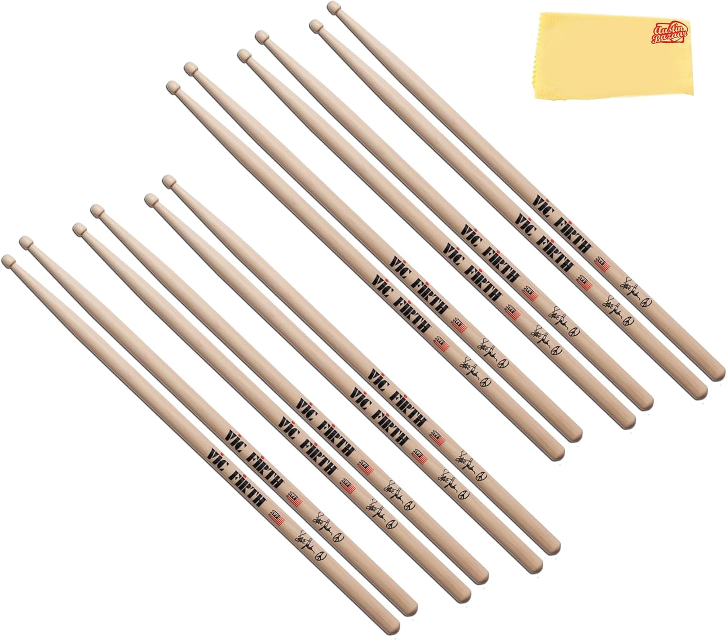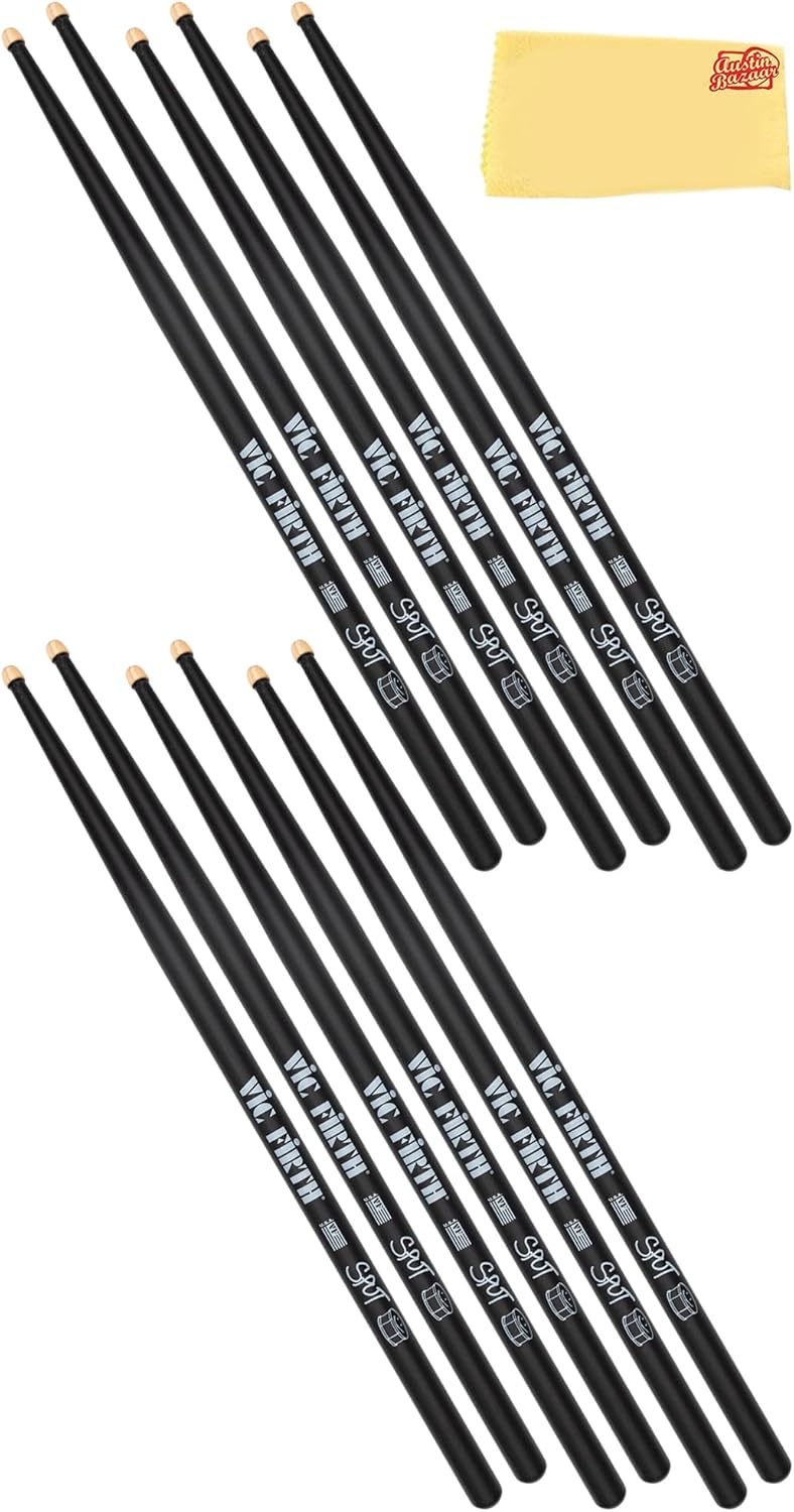 The Vic Firth Steve Jordan Signature Drumsticks are crafted to embody the finesse and versatility of the legendary drummer. With a thinner and longer build, they provide extended reach and effortless movement around the drum kit, making them ideal for fluid and expressive playing. Their lightweight design enhances both drum and cymbal articulation, allowing for a delicate yet dynamic touch, while the medium taper ensures a well-balanced feel. The barrel-shaped wood tip delivers a warm, full sound suitable for a wide range of musical styles. Made from premium USA hickory, these sticks offer durability, consistency, and a smooth lacquer finish for a comfortable grip. Designed for precision, control, and effortless playability, they provide drummers with the perfect combination of subtlety and musicality. As part of the Signature Series, the Vic Firth Steve Jordan Drumsticks are an excellent choice for musicians seeking a responsive, expressive, and well-balanced playing experience. Wood Type: Hickory Tip Material: Wood Taper: Medium Shape: Barrel Diameter: 0.53 inches Dimension: 16.5x1.05x0.53 inches Weight: 0.25 pounds Austin Bazaar bundles your purchase with essential accessories. This bundle includes 3 pairs of drumsticks and an Austin Bazaar polishing cloth to keep your sticks in mint condition.
