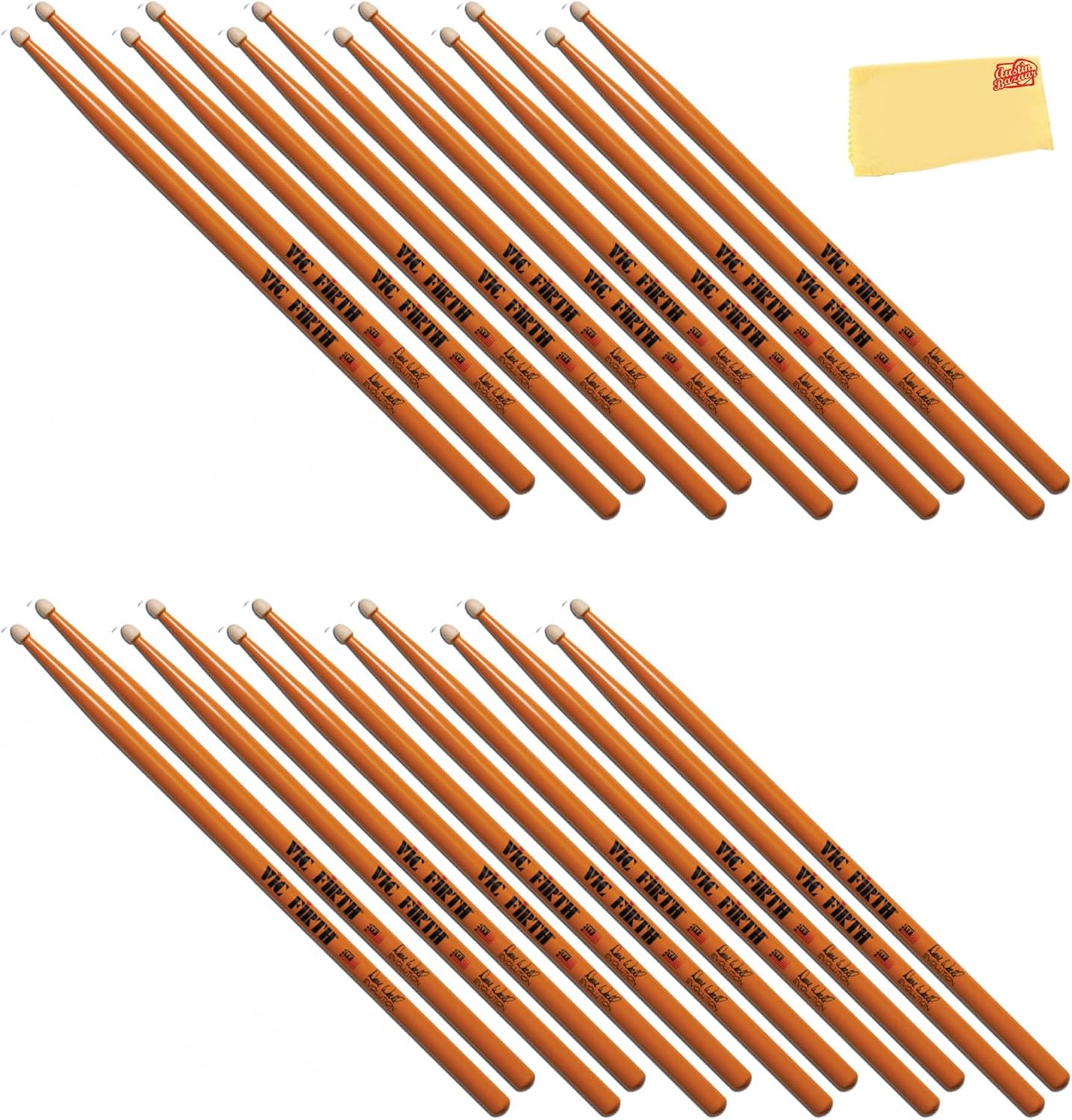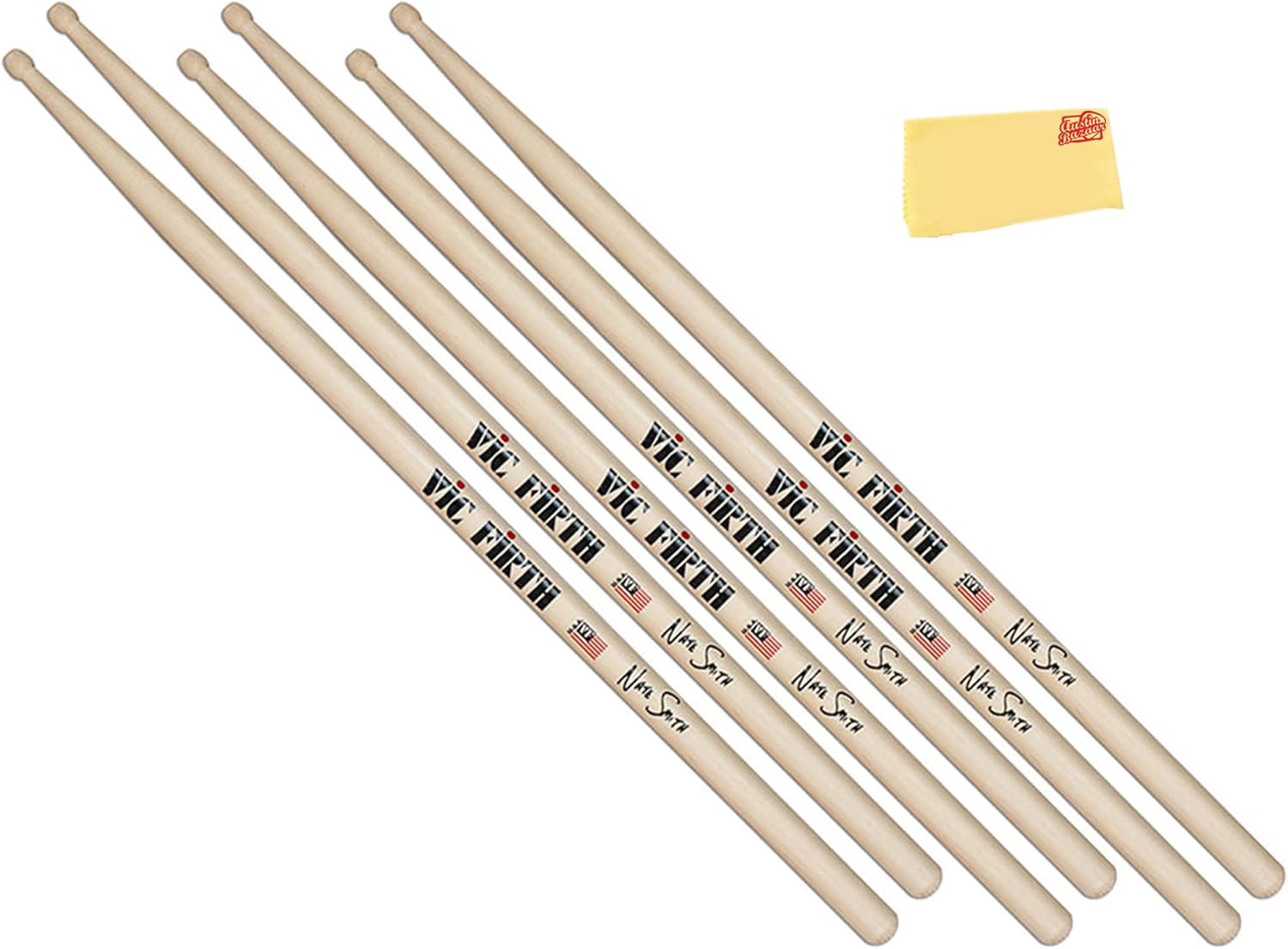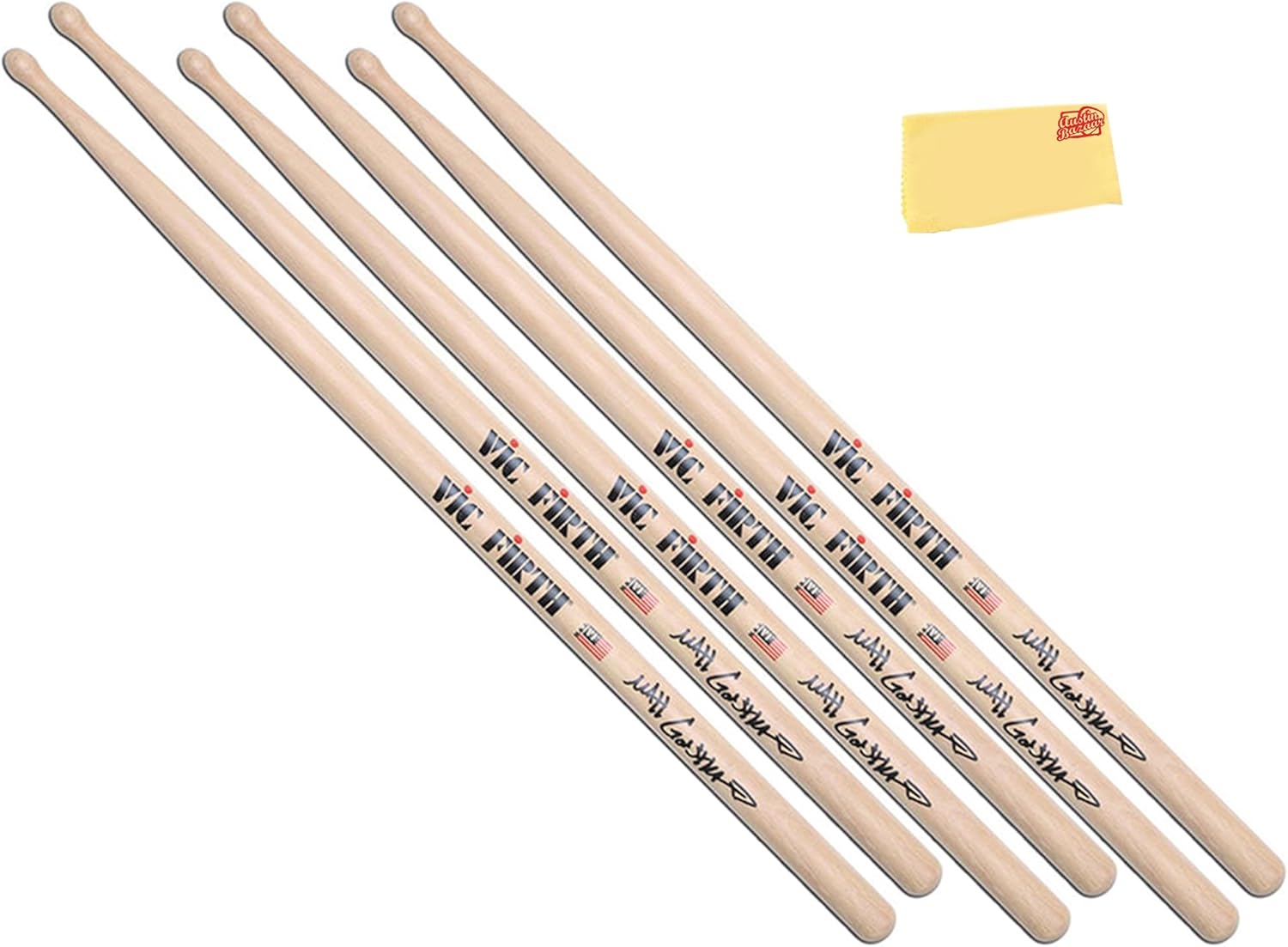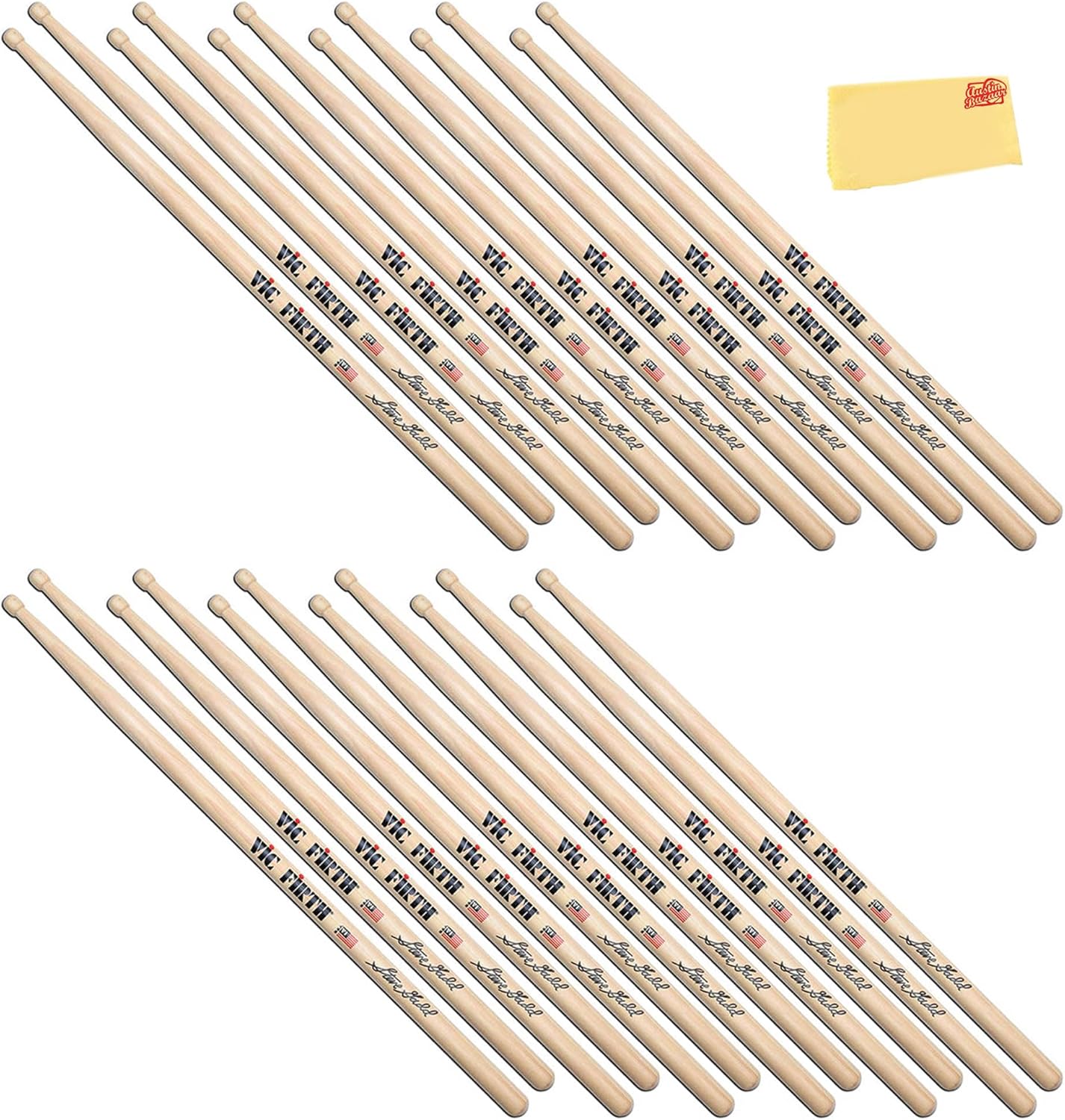 The Vic Firth Steve Jordan Signature Drumsticks are crafted to embody the finesse and versatility of the legendary drummer. With a thinner and longer build, they provide extended reach and effortless movement around the drum kit, making them ideal for fluid and expressive playing. Their lightweight design enhances both drum and cymbal articulation, allowing for a delicate yet dynamic touch, while the medium taper ensures a well-balanced feel. The barrel-shaped wood tip delivers a warm, full sound suitable for a wide range of musical styles. Made from premium USA hickory, these sticks offer durability, consistency, and a smooth lacquer finish for a comfortable grip. Designed for precision, control, and effortless playability, they provide drummers with the perfect combination of subtlety and musicality. As part of the Signature Series, the Vic Firth Steve Jordan Drumsticks are an excellent choice for musicians seeking a responsive, expressive, and well-balanced playing experience. Wood Type: Hickory Tip Material: Wood Taper: Medium Shape: Barrel Diameter: 0.53 inches Dimension: 16.5x1.05x0.53 inches Weight: 0.25 pounds Austin Bazaar bundles your purchase with essential accessories. This bundle includes 3 pairs of drumsticks and an Austin Bazaar polishing cloth to keep your sticks in mint condition.