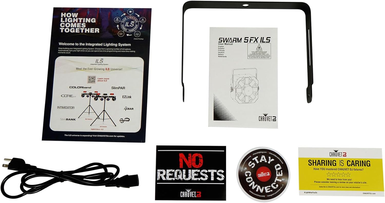 Your parties deserve the excitement of Swarm 5 FX ILS. This 3-in-1 LED light that includes an RGBAW rotating derby, red/green L-Beam, and white strobe effect and compatibility with the cutting edge Integrated Lighting System (ILS) that makes creating coordinated light shows across different fixture types easy. Swarm 5 FX ILS also features D-Fi USB compatibility for wireless Master/Slave or DMX control. Flexibility is even greater with automated and sound-activated programs, or Master/Slave and DMX modes and separate color and program control.