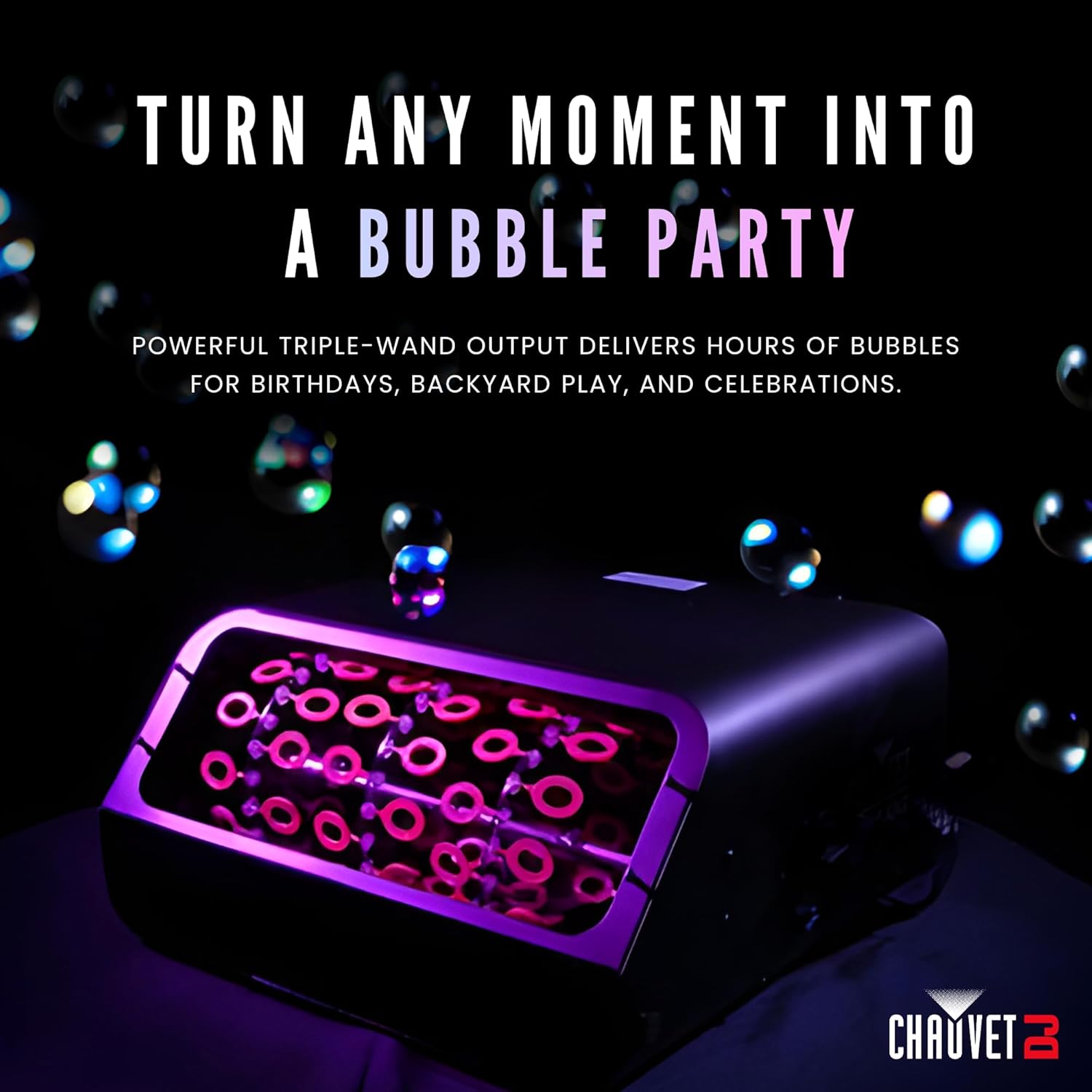 High-output bubble generator, with three double-wands, with 56 oz. Fluid capacity and 11 oz./hr fluid consumption for 5 hours of action