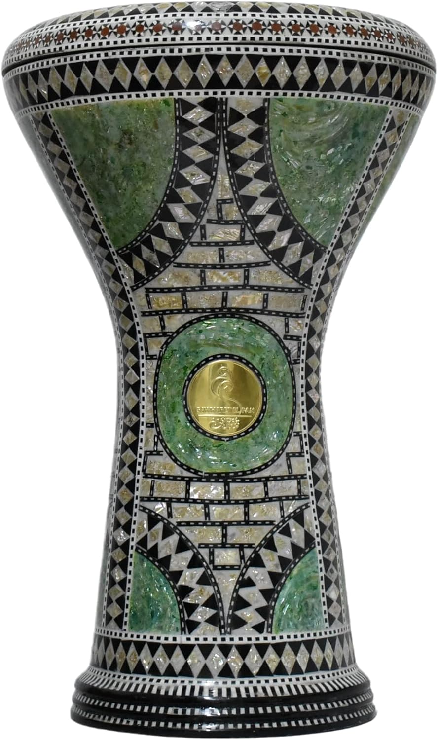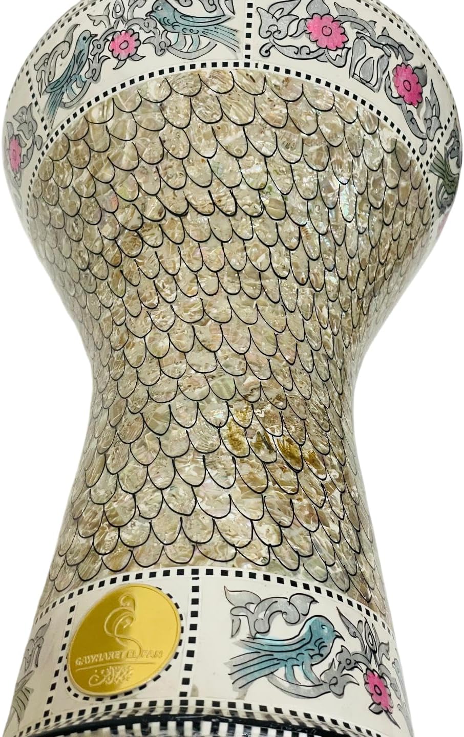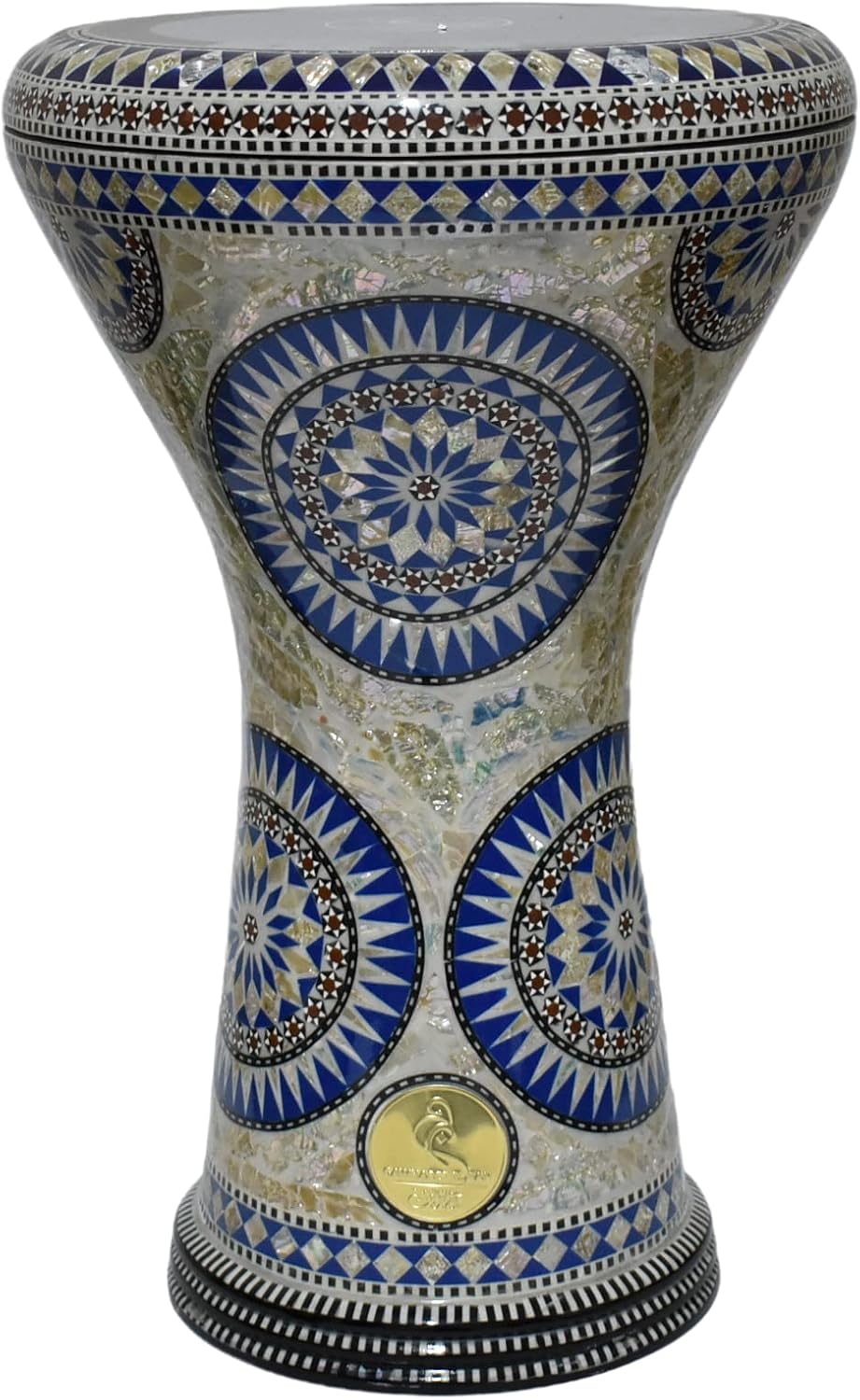this arabic darbuka doumbek drum is the best and most famous in Egypt Great classic design The body is made of cast aluminum with inlaid real white & blue mother of pearl in a beautiful artistic way ,, inlaid the pearl are made by creative Egyptian artists , It has a synthetic head with 6 tuning bolts. Coming with a Luxury case, extra clear synthetic head and tuning tool. Height : 17 Inches (42.5cm), Head Diameter : 10.5 inches (26.25cm), Bottom diameter : 7.5 inches (18.75cm), Skin head diameter : 8.75 inches,,,,weight 5 kgm