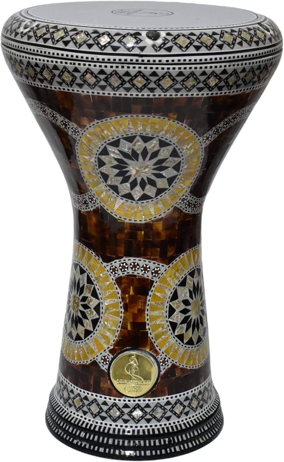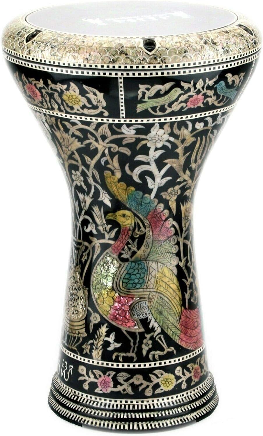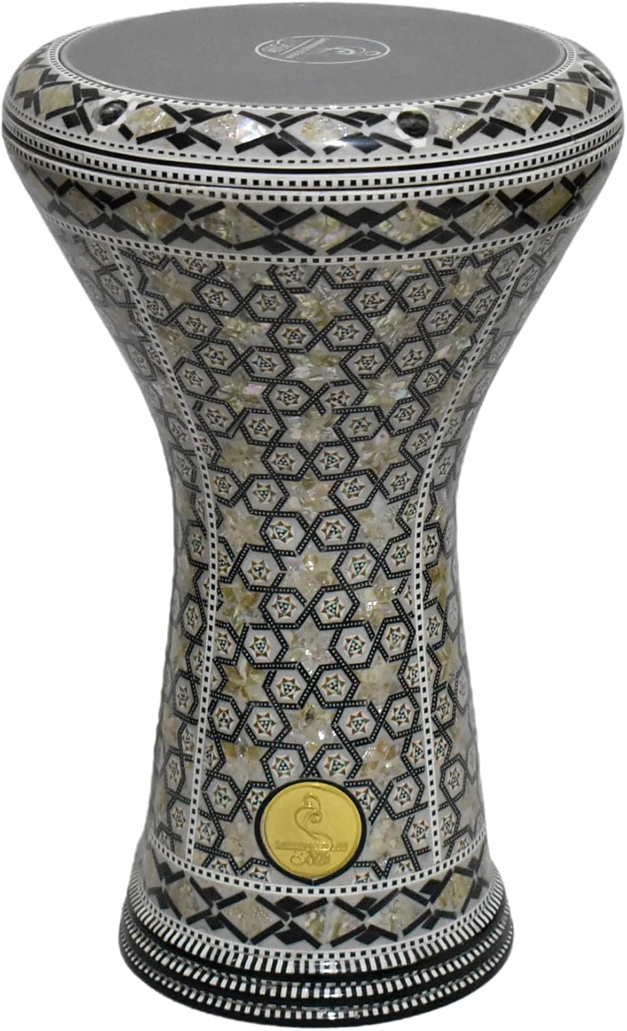 this arabic darbuka doumbek drum is the best and most famous in Egypt Great classic design The body is made of cast aluminum with inlaid real white & blue mother of pearl in a beautiful artistic way ,, inlaid the pearl are made by creative Egyptian artists , It has a synthetic head with 6 tuning bolts. Coming with a Luxury case, extra clear synthetic head and tuning tool. Height : 17 Inches (42.5cm), Head Diameter : 10.5 inches (26.25cm), Bottom diameter : 7.5 inches (18.75cm), Skin head diameter : 8.75 inches,,,,weight 5 kgm