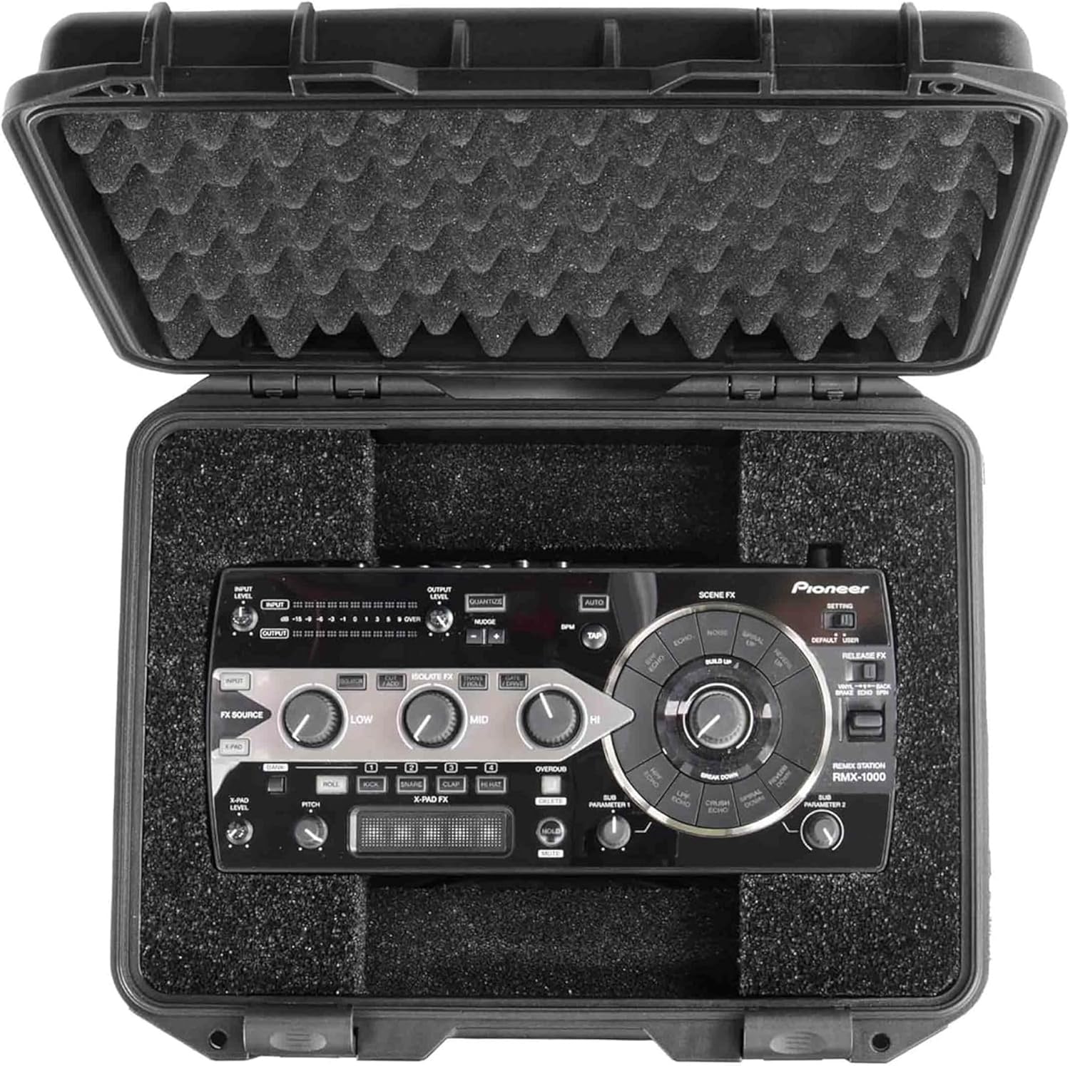 Formatted to fit the Pioneer DJ RMX-1000, Odyssey offers the VURMX1000, a watertight and dust-proof case for the RMX-1000. The case is also impact resistant. The case is injection molded with a high strength polymer resin.Features and Specifications, Impact Resistant Injection Molded Polymer Construction, Watertight ; Dust-proof, Comfortable ; Sturdy Carrying Handle, Soft Convoluted Egg Foam Lid Lining, Pressure Release Valve, Padlock Holes, Quick Opening and Locking System, Stackable Exterior Shell Design, 15.25" x 10.5" x 3.5" (bottom interior compartment without the foam)*** Props used in the product pictures or the interior of the soft cases/bags such as DJ controller, DJ mixer, different parts of the DJ podium, mixing console, accessories, speaker, TV monitor, cable, laptop, computer, microphone, headphones, sneeze guard, slipmat, turntable, turntable needle, etc are not included with the product. ***,Approx. Overall Product Dimensions (Edge to Edge): 16.5" W x 13" D x 6" H, Approx. Interior Dimensions: 15.25" W x 10.5" D x 3.5" H, Approx. Weight: 5 lbs, Approx. Shipping Dimensions: 17.3" x 13.5" x 6", Approx. Shipping Weight: 6 lbs, Approx. Case Lid Interior Height: 1.875",