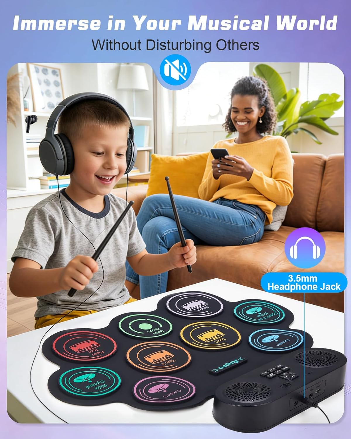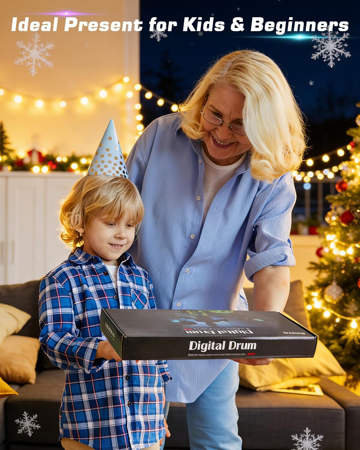 | Included Components | Bass Drum, Tom 1, Snare Drum, Hi-hat (Open/Close), Crash Cymbal 1, Crash Cymbal 2, Ride Cymbal, Floor Tom, Tom 2, drum pedals, drum sticks, built-in dual stereo speaker, headphone output, Aux port |