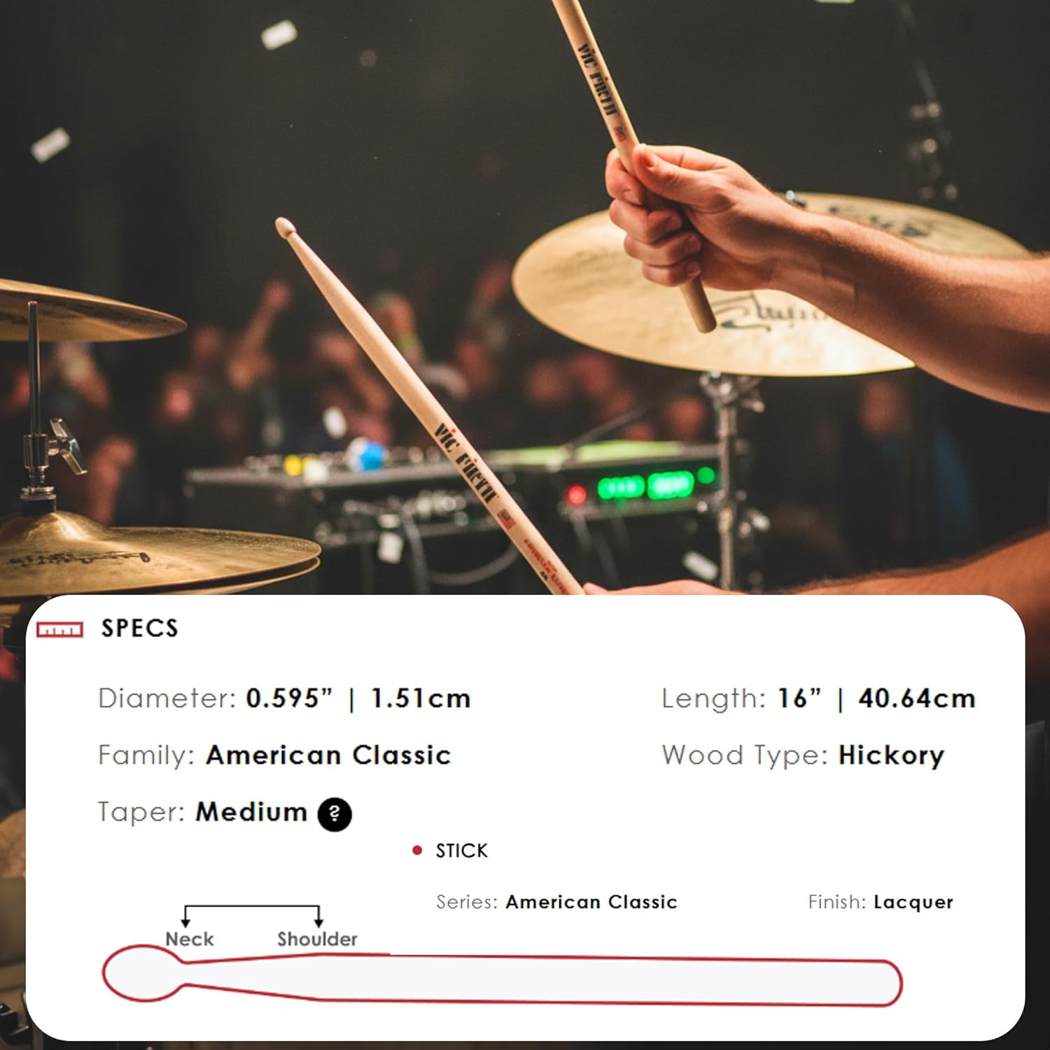 The American Classic 5B has long been one of the world’s most popular drumstick models. The American Classic line combines tradition and Vic Firth style. With bold designs, the Classics are turned from select hickory - a dense wood with little flex for a more pronounced sound. Hickory is also capable of withstanding a great deal of shock, making it highly durable. The tips are deeply back-cut for intensified cymbal response. Diameter: .595" Length: 16" Taper: MediumSeries: American ClassicSurface Coating: LacquerMaterial: HickoryTip Shape: Tear DropAdding value to your purchase, Austin Bazaar bundles your instrument with quality accessories, saving you time and money. An Austin Bazaar polishing cloth is included so you can keep your gear in mint condition. Everything you need to play right out of the box!