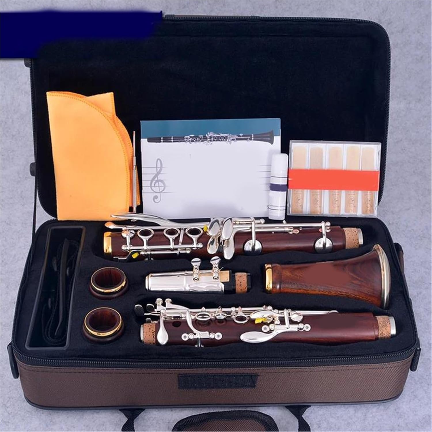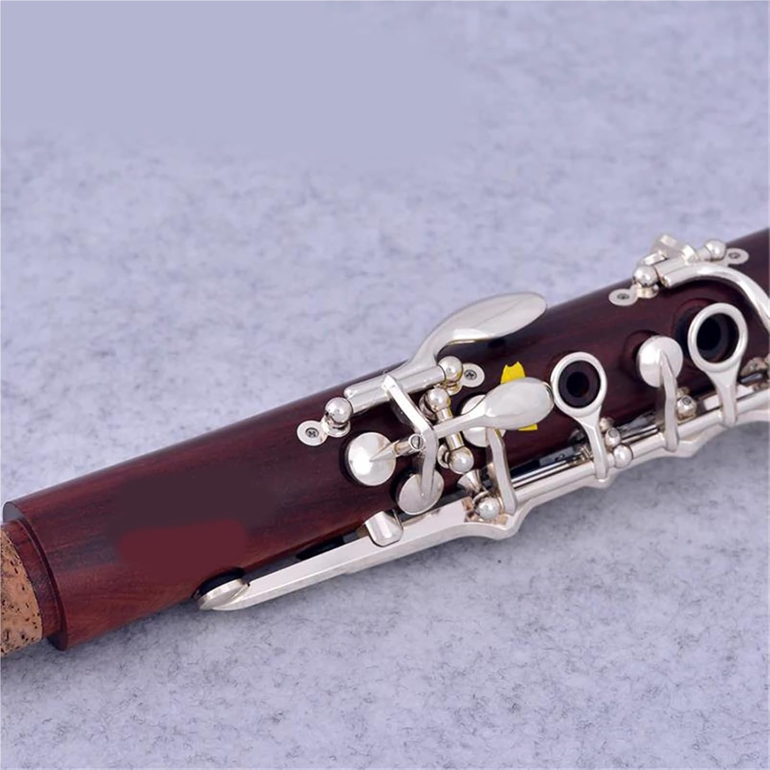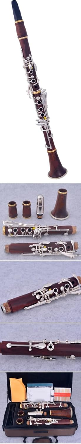 The clarinet has a robust structure and a classic appearance and sound.Tone: BBKey material: copper nickelNumber of keys: 17Surface material: nickel-platedModel: M19Origin: Mainland ChinaCrafted from carefully selected rubberwood, it enhances sound projection and ensures accurate intonation, making it an ideal choice for beginner and intermediate clarinet players seeking professional-grade tone.