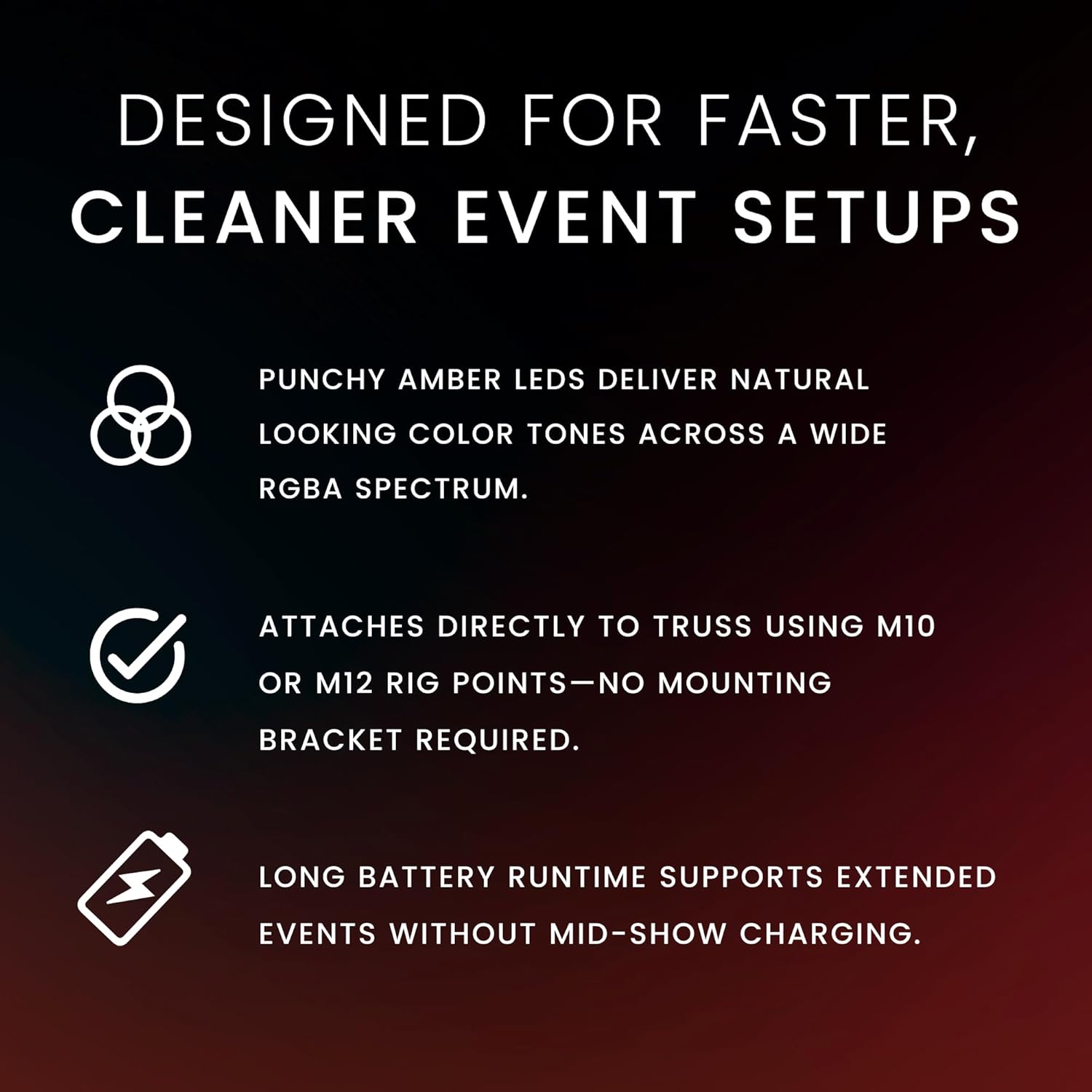 EZLink Wedge Q3BT ILS is a 100% TRUE wireless, battery-operated, quad-color (RGBA) LED wash light solution. Its wedge-shaped design makes it the ideal fixture for venue corners, Trusst Goal Post and Arch Kit truss systems. Enjoy a wide range of control options including the IRC-6 remote, ILS, Bluetooth, and DMX. Generate a broad spectrum of colors and achieve natural-looking color temperatures throughout your event thanks to punchy amber LEDs.