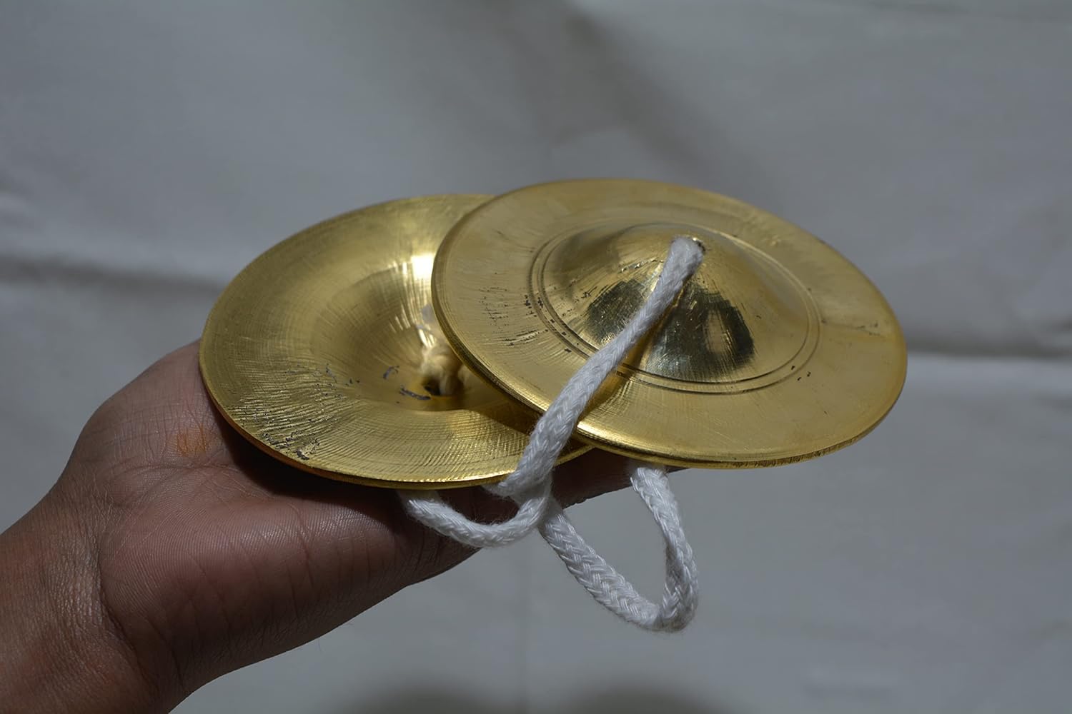 Dimensions : Size: 3.5"inch Weight: 290 grams Color :Golden Material: Brass Enhance your devotional practices with these Brass Manjira Cymbals, a traditional Indian hand percussion instrument widely used in bhajan, kirtan, and aarti rituals. Made from high-quality solid brass, these small kartal cymbals produce a clear, rhythmic, and uplifting sound that enriches spiritual gatherings and meditation sessions. The attached durable rope ensures a comfortable grip and easy handling while playing. Perfect for temple worship, home puja rooms, yoga classes, mantra chanting, and festive celebrations, these manjira cymbals help create a divine and energetic atmosphere. Compact, lightweight, and easy to carry, they are suitable for daily worship as well as professional devotional performances.