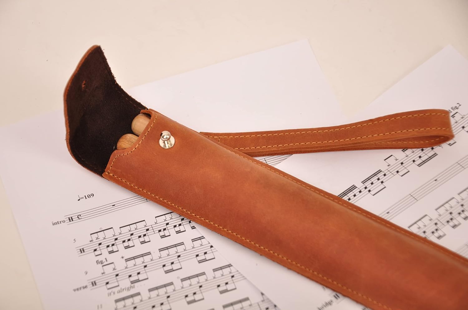 Genuine leather drumstick pouch made by MG Leather Work combines long life, pleasant texture and attractive design. It's aimed at holding two drumsticks and providing them with full protection. Comfortable button stud closure allows having quick access to the accessories. The pleasant to touch genuine leather looks classy and unique, and saves its properties even being used every day. Due to the variety of colors you can choose the drum stick holder of dark blue, brown, green, red and other colors. Such a functional and practical bag is an excellent gift for drummers of any skill level – for professionals and aspiring musicians. If you want to prepare a useful present for your friend, who plays drums, pick this one!