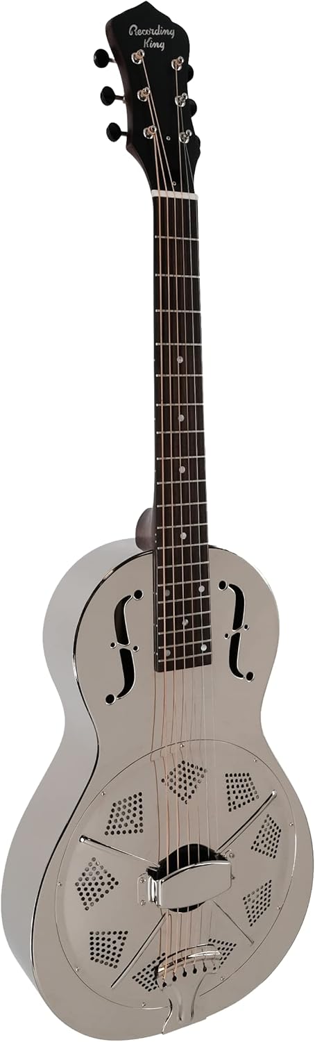 The Recording King Parlor Metal Body Resonator resonator puts traditional reso style into a small body design that packs a punch. True resonator tone begins with a classic nickel-plated bell brass body and RK’s own full-size hand-spun 9.5" cone. This is the same custom cone from RK’s best-selling resonators like the Swamp Dog. Thanks to the smaller body size and 24-¼” scale length, the Parlor Resonator has a slightly different voice than other metal body instruments. It has all the swampiness and mid range of a classic biscuit-style metal body, but the unique design adds a little more treble shimmer, giving it extra top-end clarity. Recording King guitars never cut corners on the building blocks of great tone, and the Parlor Resonator delivers classic sound, tons of vibe and roadworthy reliability whether you’re just discovering resonator, or you’re a professional player.